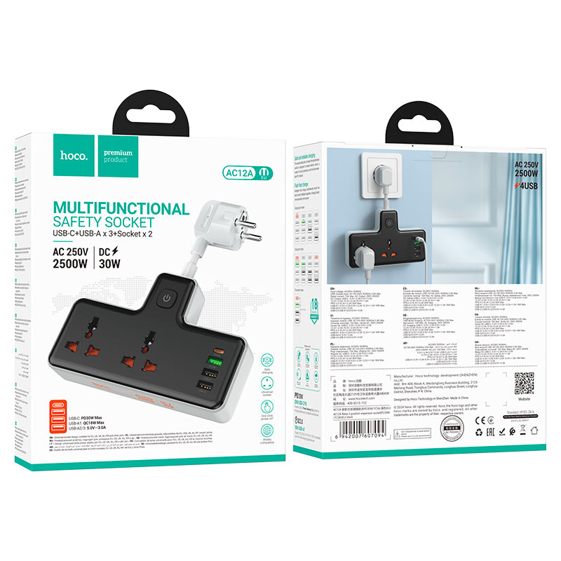 Declutter your workspace and supercharge all your devices with the HOCO AC12A Reise Power Strip. This compact hub is a powerhouse, offering 2 AC outlets capable of delivering a massive 2500W of power, perfect for your computer setup, gaming console, or desk lamp. But it doesn’t stop there—it’s also an advanced charging station. The USB-C port delivers up to 30W with Power Delivery 3.0 and PPS, efficiently charging a MacBook Air, iPad Pro, or Samsung Galaxy phone at top speed. The three additional USB-A ports support various fast-charging protocols like QC3.0, ensuring all your gadgets charge quickly. The genius universal socket design accepts virtually any plug type, eliminating the need for bulky travel adapters. Encased in safe, flame-retardant PC material and with a compact footprint, the AC12A is the ultimate all-in-one power solution for your home, office, or travel bag.