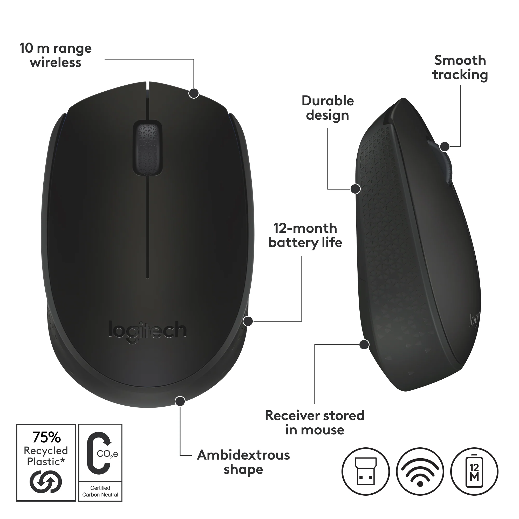 Logitech M170 Wireless Mouse | 12-Month Battery | 2.4GHz USB Nano Receiver | 1000 DPI | Plug & Play | for PC, Laptop, Mac (Black) 910-004658