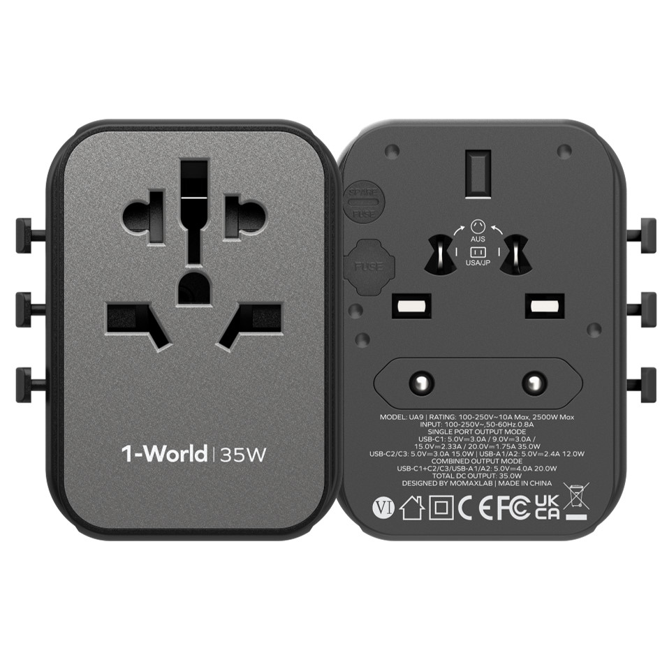 Experience Unmatched Convenience with the MOMAX UA9D 1-World 35W 5-Port+AC Travel Adapter