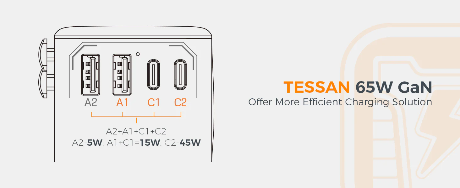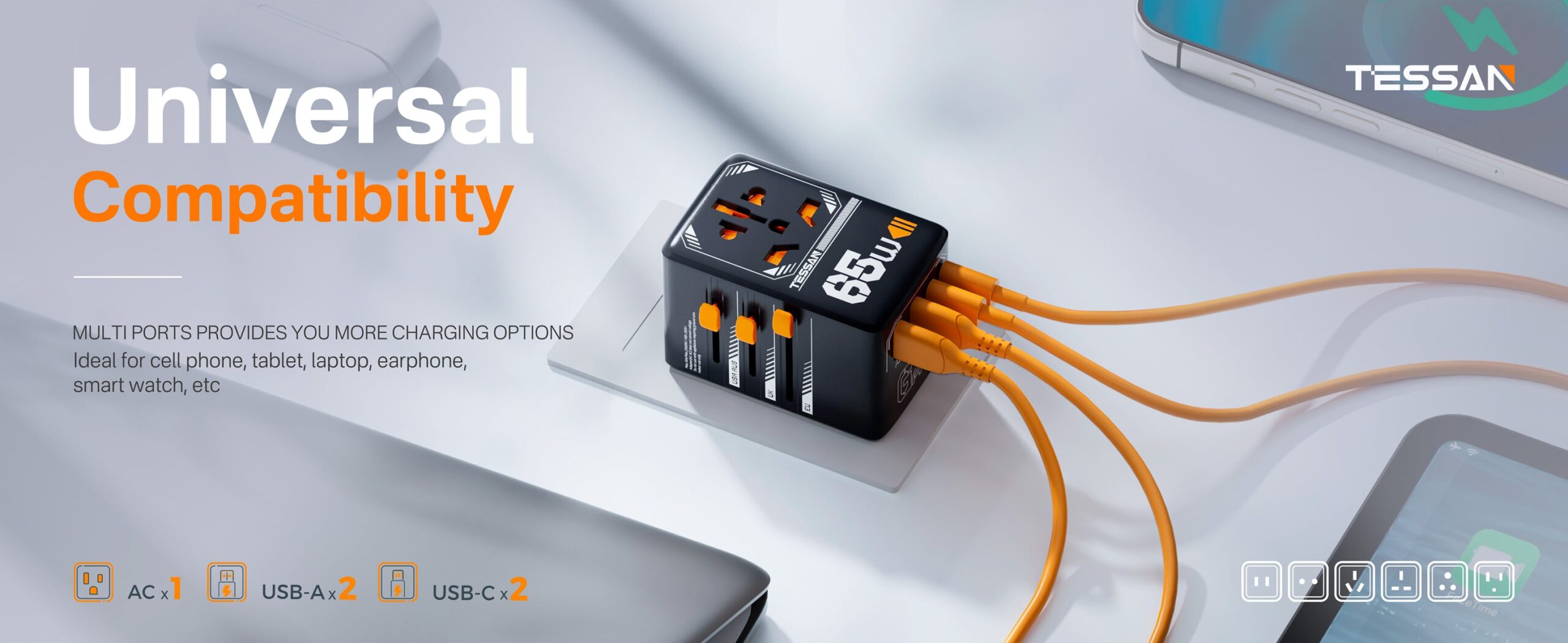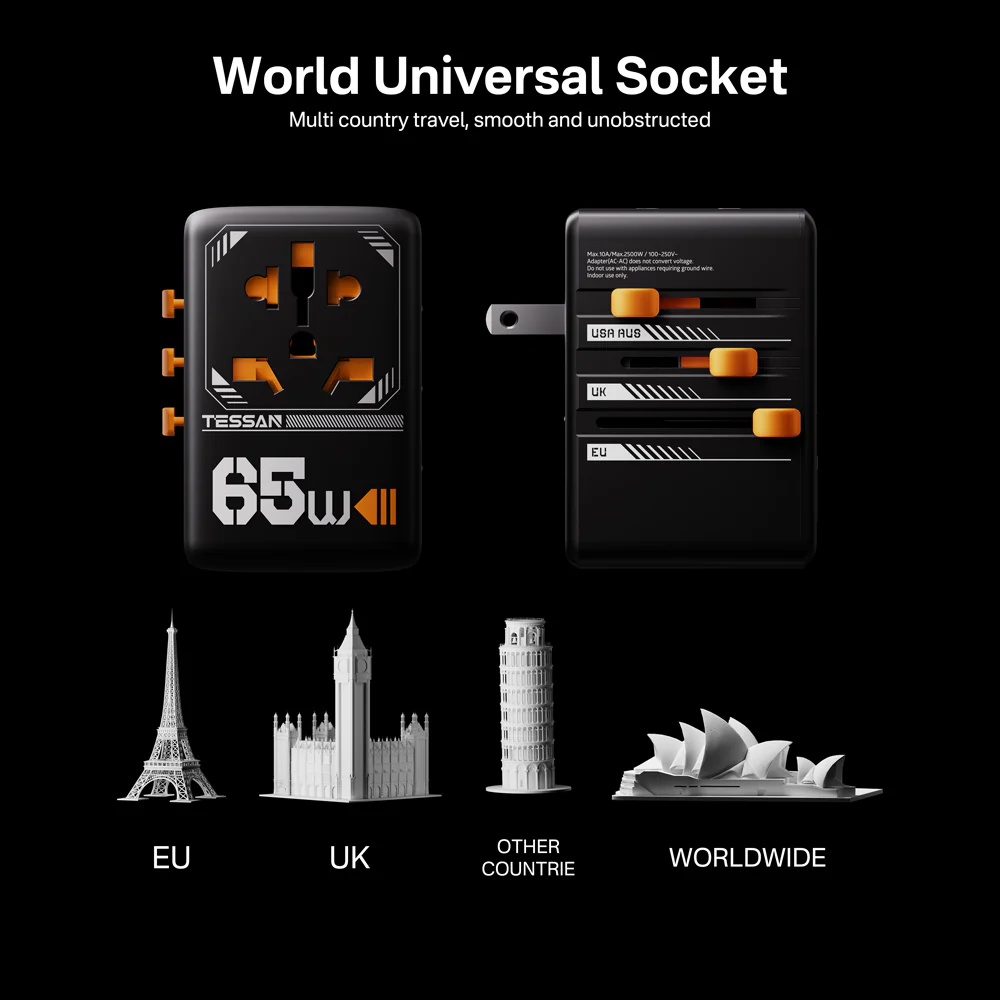 The TESSAN TS-WTA03 combines 65W GaN fast charging with universal plug compatibility, making it the perfect companion for international trips, cruises, or business travel.