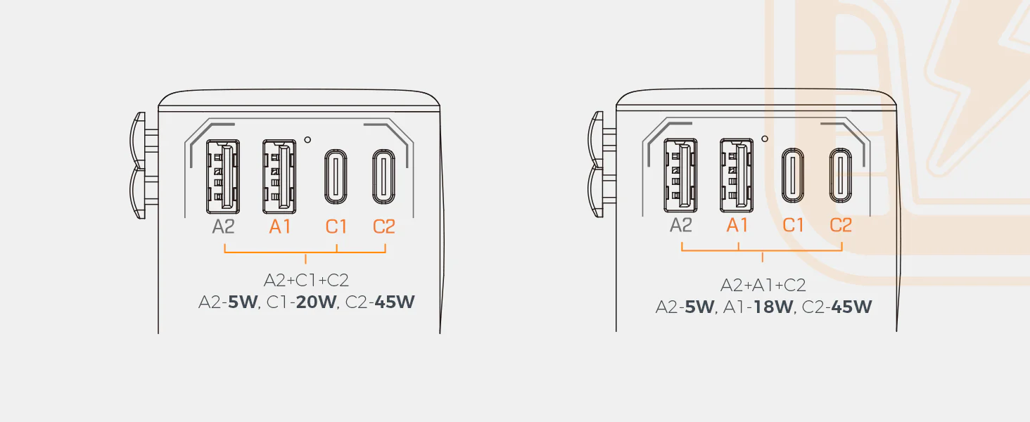 - USB-A1: 60W QC (5V/3A, 9V/2A, 12V/1.5A)
