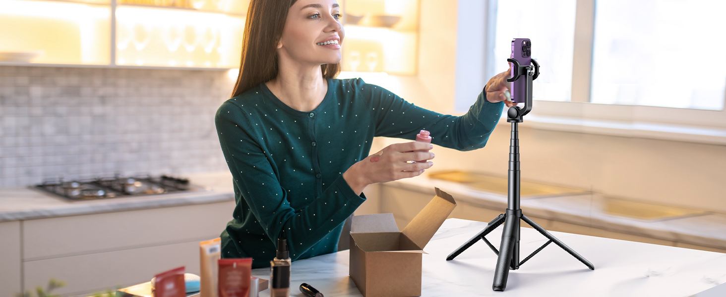 Capture the perfect shot every time. The included Bluetooth remote shutter pairs instantly with your phone, letting you control your camera from up to 10 meters away. Whether you’re filming a tutorial, going live on social media, or taking a family photo, you’re always in the frame. With an adjustable height range of 12.5 to 63 inches, you can set up for a low-angle product shot or a high-angle vlog with ease. The 360-degree rotating phone clamp and 200° adjustable neck give you complete creative freedom to find the most flattering angle.