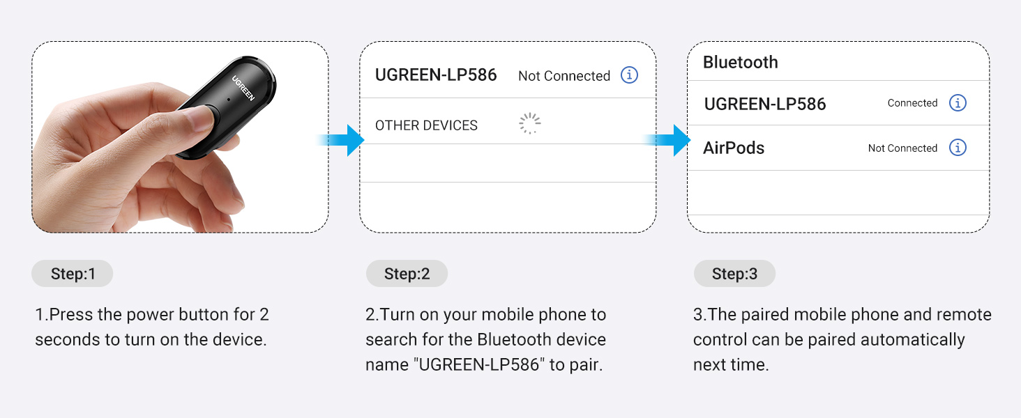 You simply enable Bluetooth on your phone, then press the button on the remote. It will appear as a device to pair, similar to Bluetooth headphones.