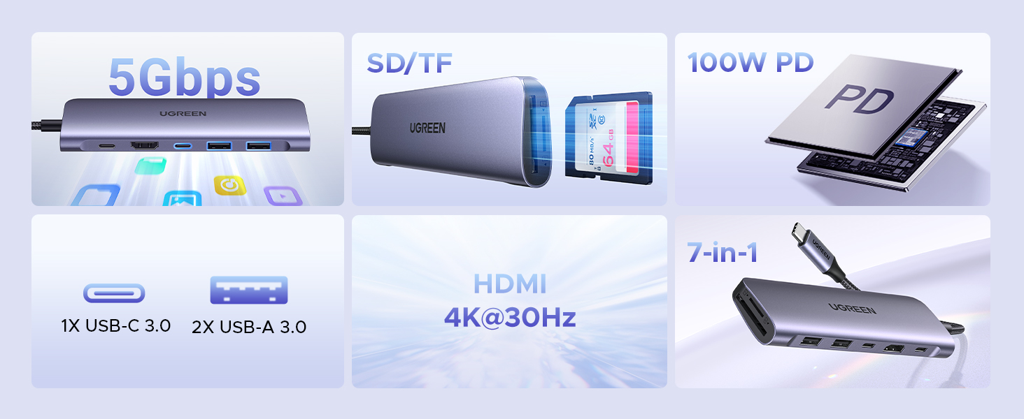 UGREEN 15214 Revodok 1071 USB-C Hub – 7-in-1 Dock with 4K HDMI, 100W PD, USB-A/C 5Gbps, SD/TF Card Reader for MacBook, iPad, Dell XPS