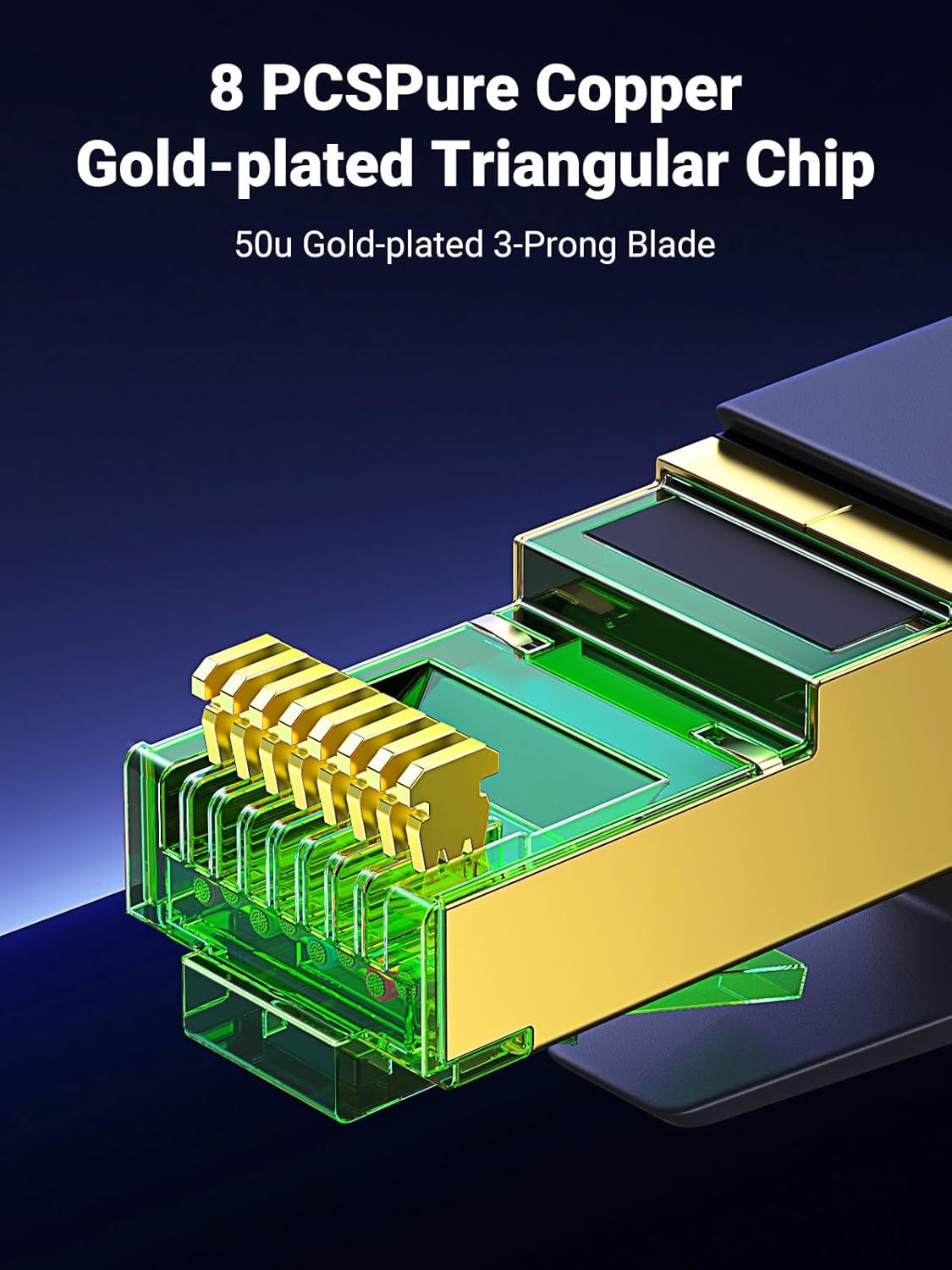 - Faster & More Stable Network:26AGW Pure copper core conductor, 4 shielded foil twisted pairs lower resistance, higher conductivity. The 50µ thickened Pure Copper Gold-plated Contacts not only enhance signal conductivity but also are more resistant to oxidation and wear.