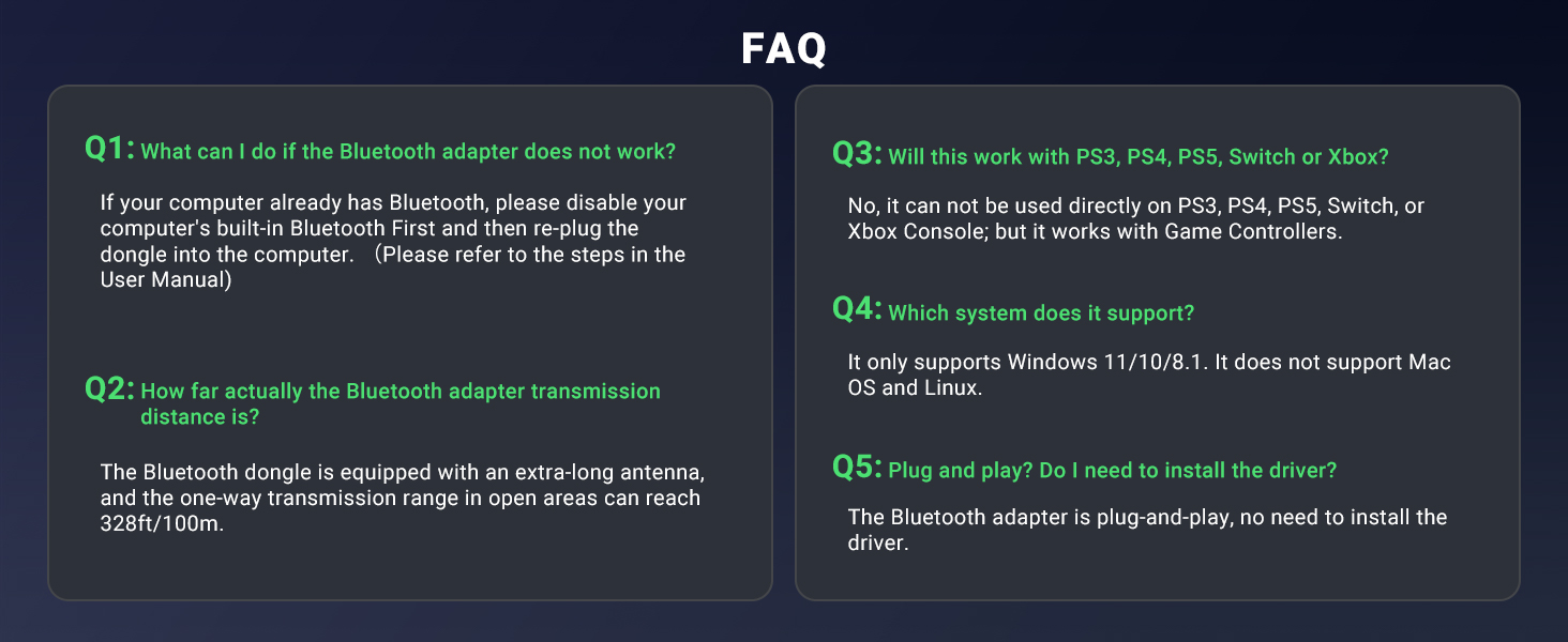 - What Can I do if the bluetooth adapter can not work?: Ensure there are no other Bluetooth devices installed on the computer. If there are, disable all existing Bluetooth devices in "Device Manager", then insert the adapter and try again. (Detailed information please read the user manual)
