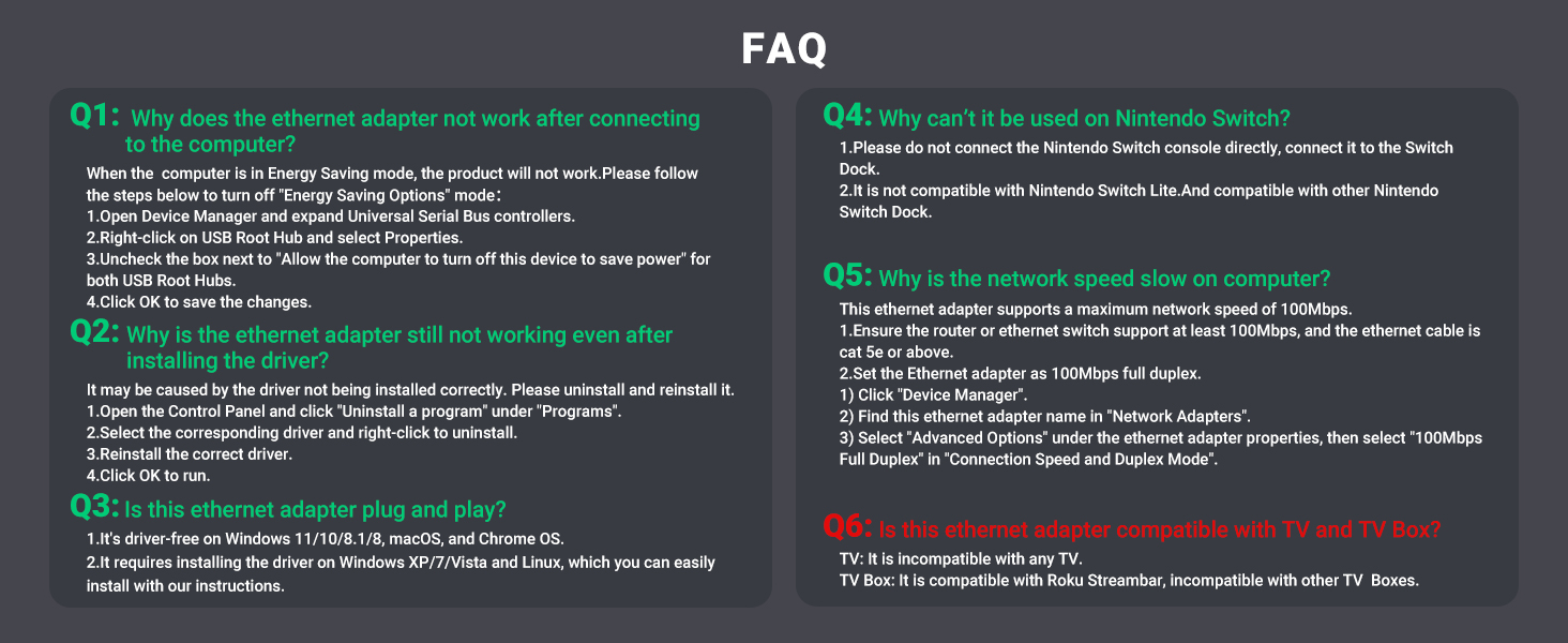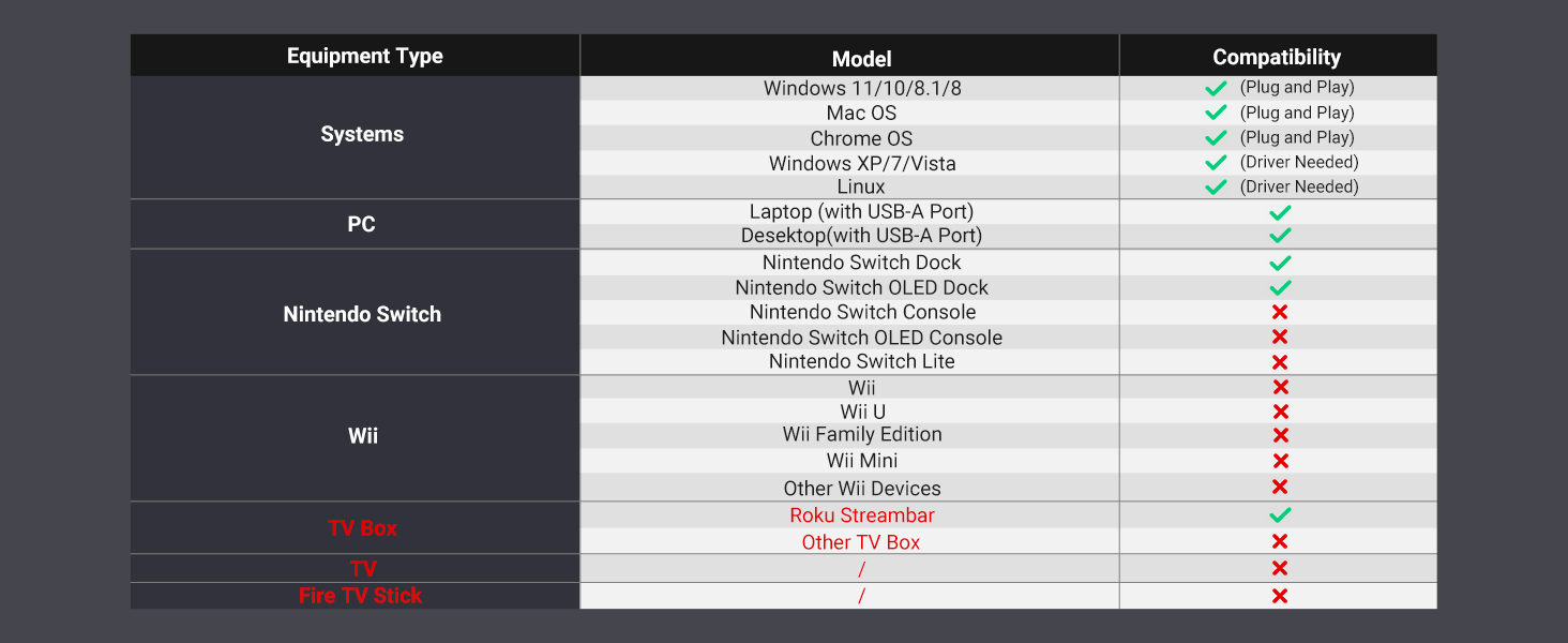 - Wide Compatibility: UGREEN usb network adapter is compatible with Nintendo Switch, Nintendo Switch Oled, Laptop, Desktop, Roku Streambar, and more USB-A devices. (Not compatible with Nintendo Switch Lite, Wii, Other TV Boxes, all TV and Fire TV Sticks.)