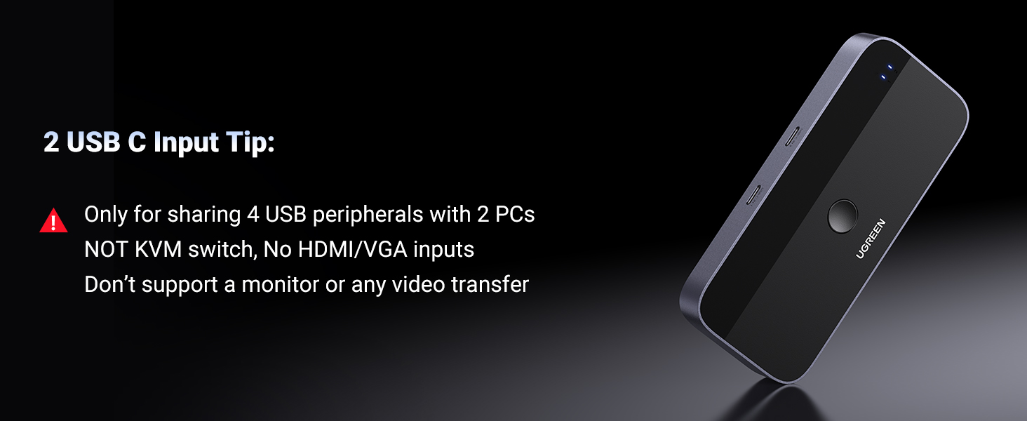 UGREEN 25098 USB-C Switch Selector – 2-in-4-Out USB 3.0 Hub for Keyboard, Mouse, Webcam Sharing Between 2 PCs (with Remote Control)