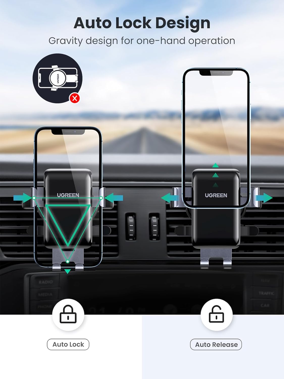 A: With the gravity auto lock design , this car phone cradle enables one-hand operation. Simply place your phone in the cradle, and gravity automatically secures it. Lift to release – no buttons or clamps to adjust. Purchase from the UGREEN Official Distributor in Pakistan to ensure you receive genuine products with full warranty support.