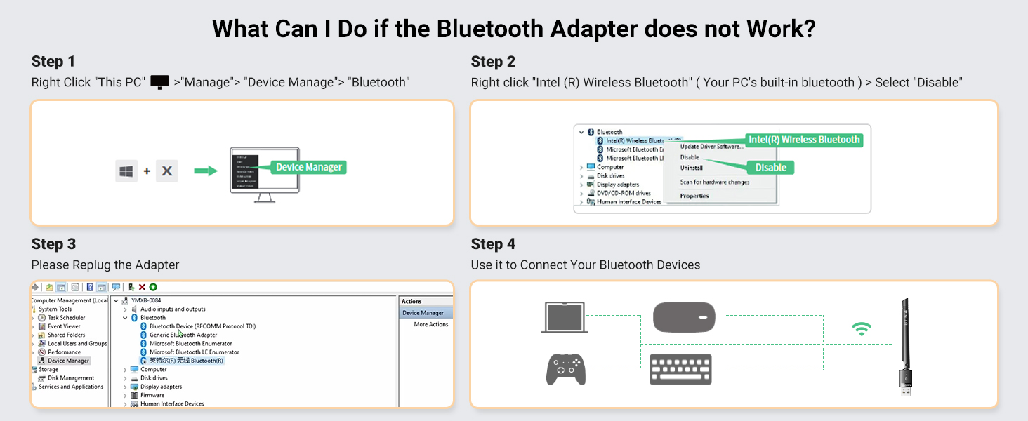 - What Can I do if the Bluetooth adapter can not work?: Ensure there are no other Bluetooth devices installed on the computer. If there are, disable all existing Bluetooth devices in "Device Manager", then insert the adapter and try again. (For detailed information please read the user manual)