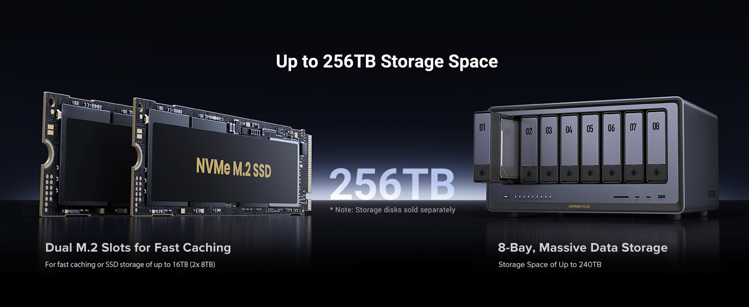 - Maximum Raw Storage Capacity: 256TB (configured as 8x 30TB SATA drives + 2x 8TB M.2 SSDs)