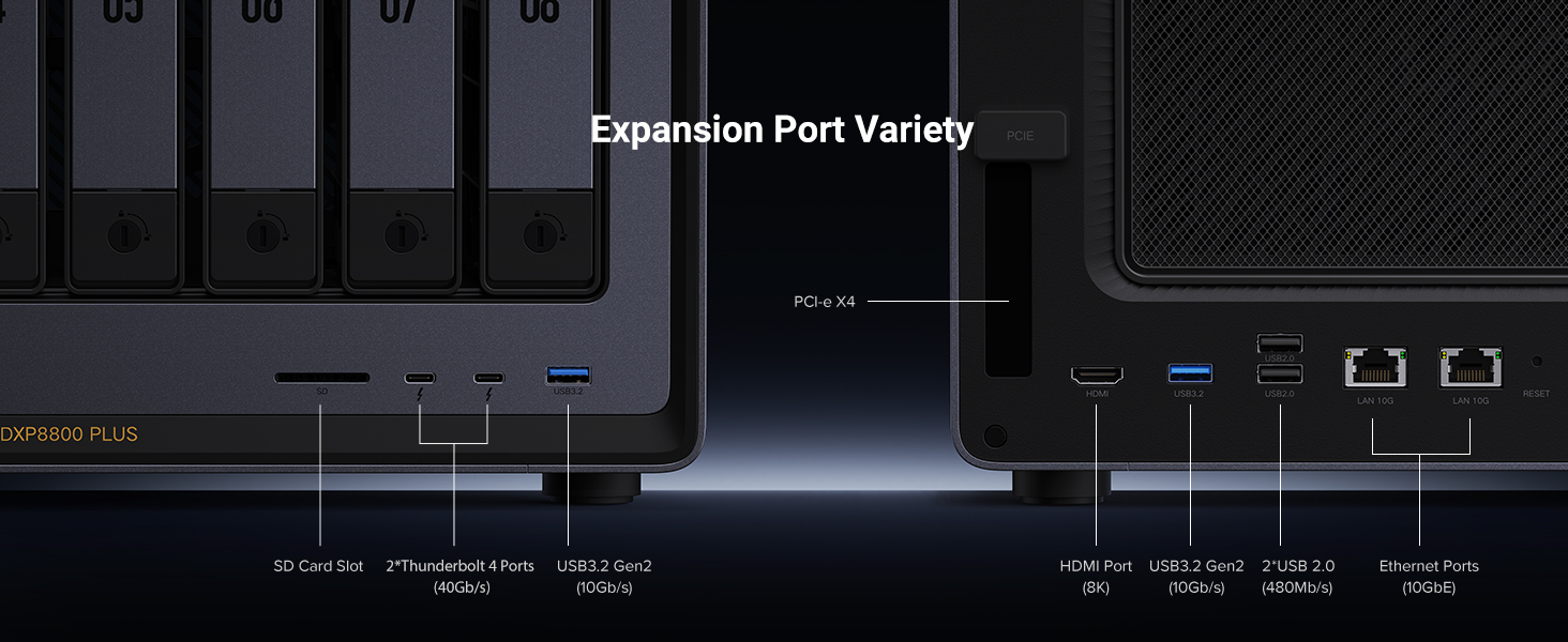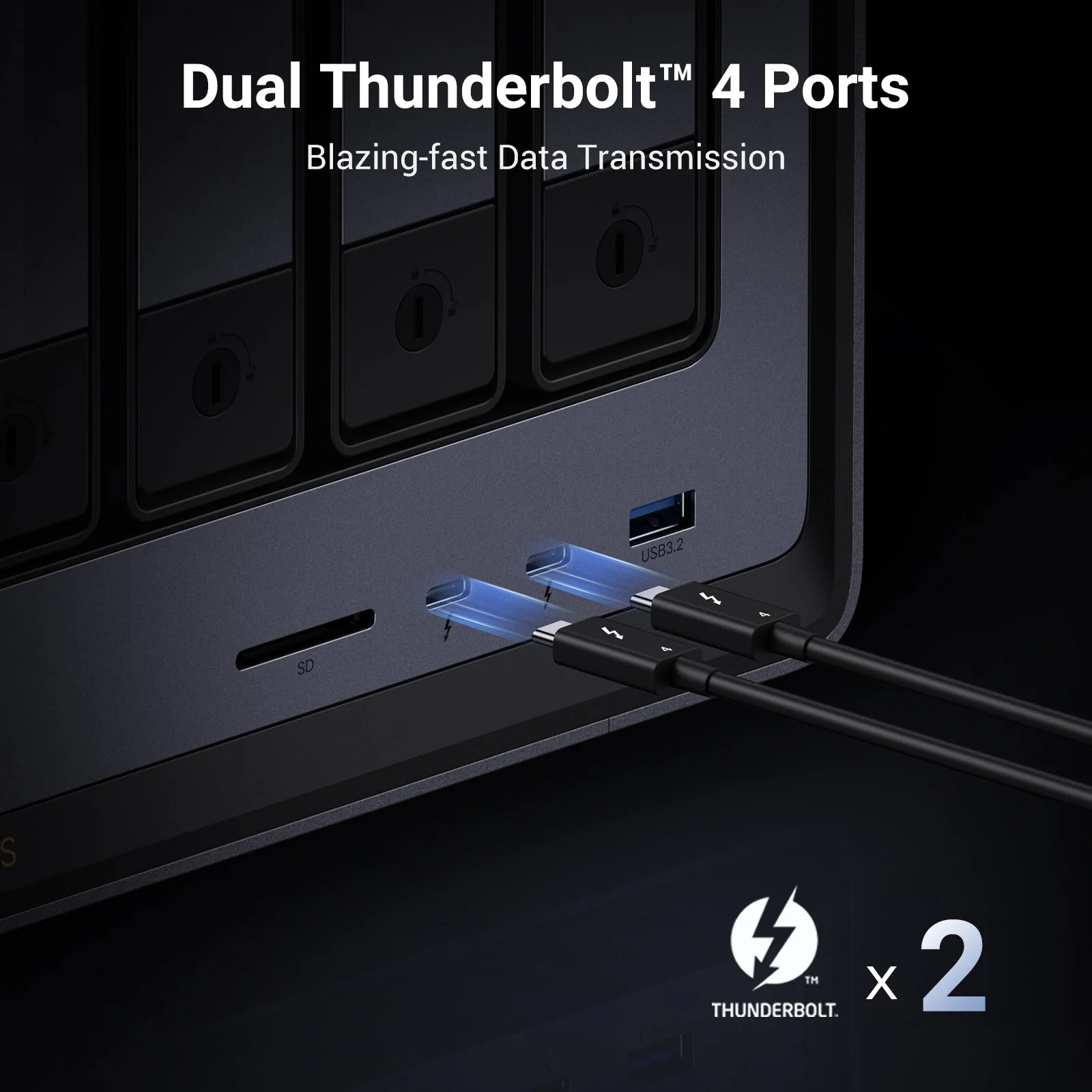 The Thunderbolt 4 ports provide a direct, ultra-high-speed (40Gbps) connection for computers, ideal for video editors to work directly from the NAS or to connect a high-resolution monitor.