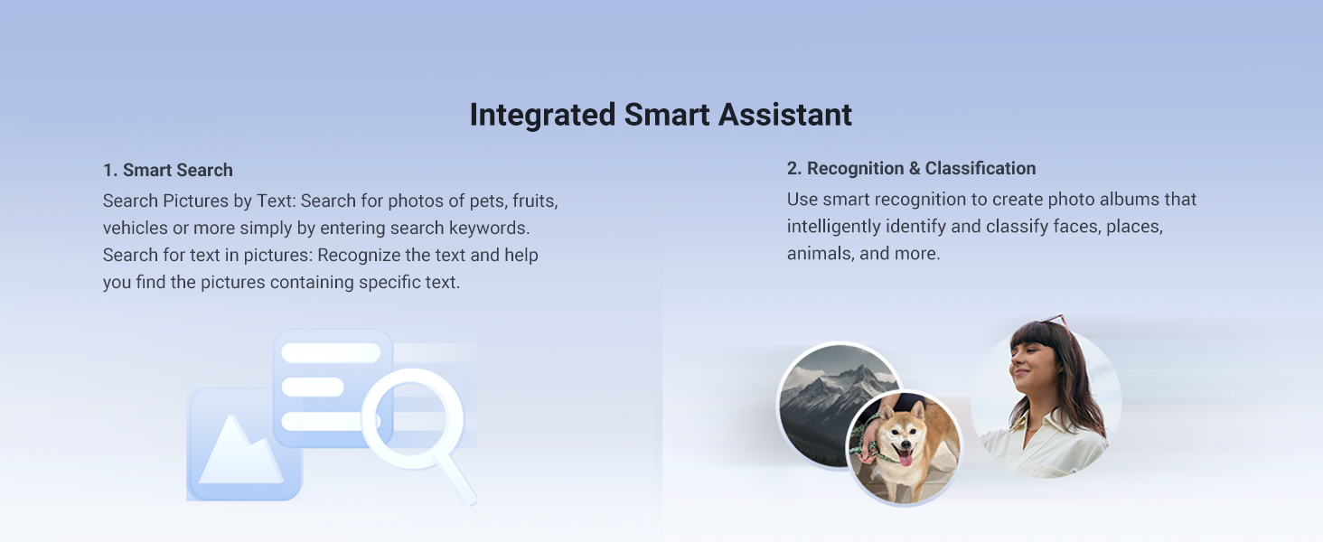 The AI Photo Album uses machine learning to automatically recognize faces, objects, and scenes in your photos, organizing them into searchable albums and removing duplicates to save space.