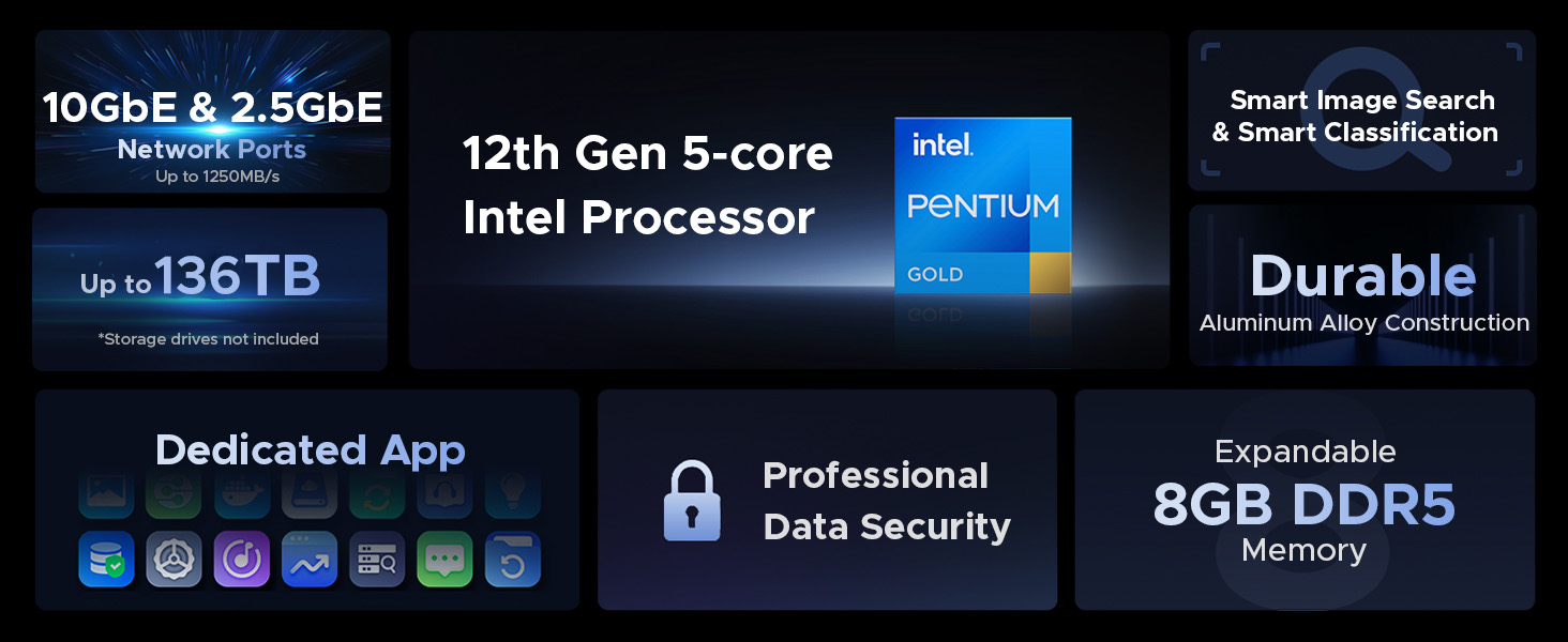 At its heart lies the Intel Pentium Gold 8505 CPU, a significant step up from entry-level chips, providing the muscle needed for seamless 4K video editing over the network, hosting complex applications, and efficient hardware transcoding. The game-changing 10GbE network port offers data transfer speeds up to 10 times faster than standard Gigabit Ethernet, making it possible to work directly from the NAS on large video projects or database files.