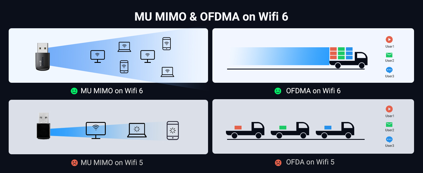 - Wifi 6 High-speed Transmission: The UGREEN Wi-fi 6 dongle supports the new generation of WiFi6 technology with transmission speeds of up to 600 Mbps on 5 GHz + 287 Mbps on 2.4 GHz, enabling lightning-fast transmission of video at wireless speeds of up to 900 Mbps; ultra-high speed and low latency.