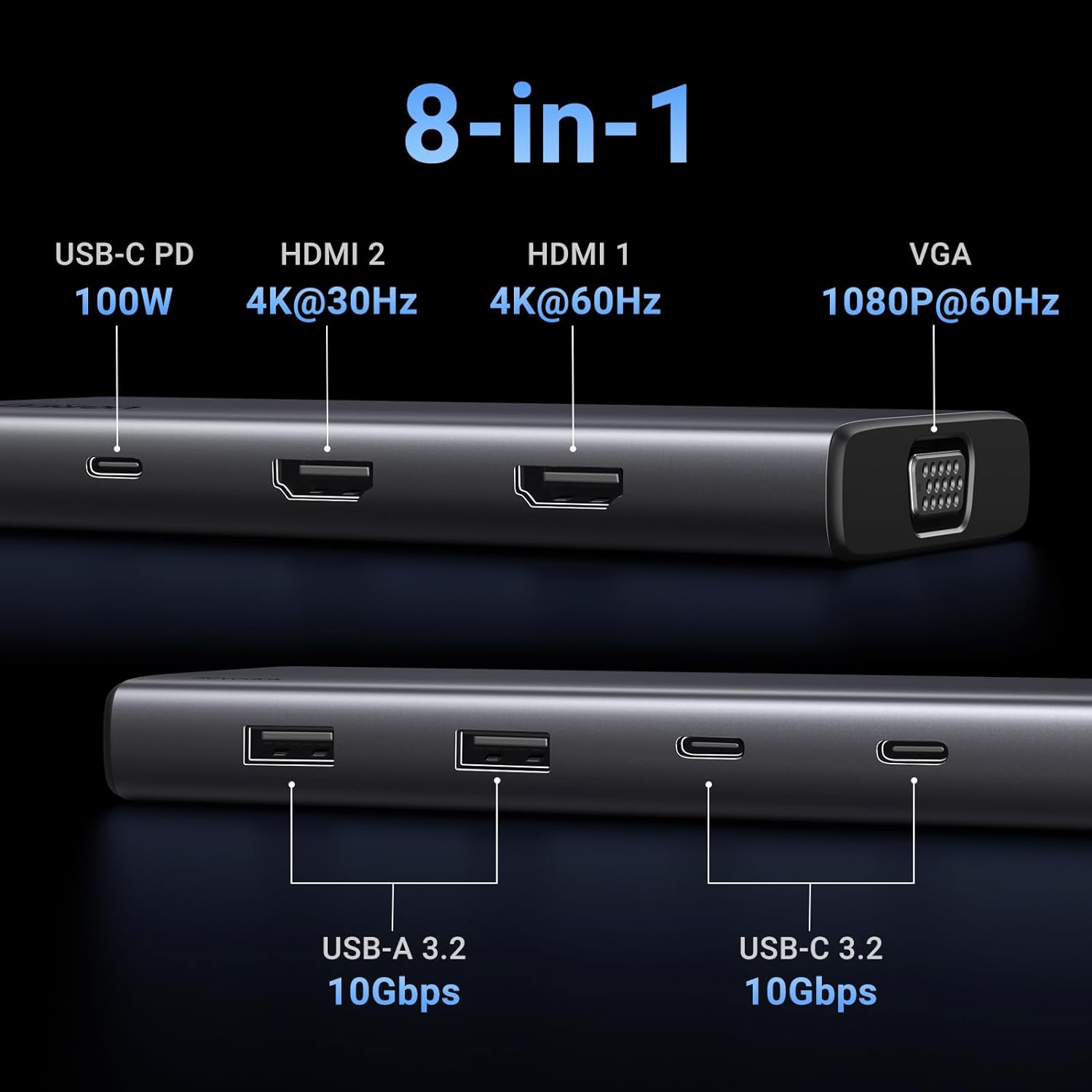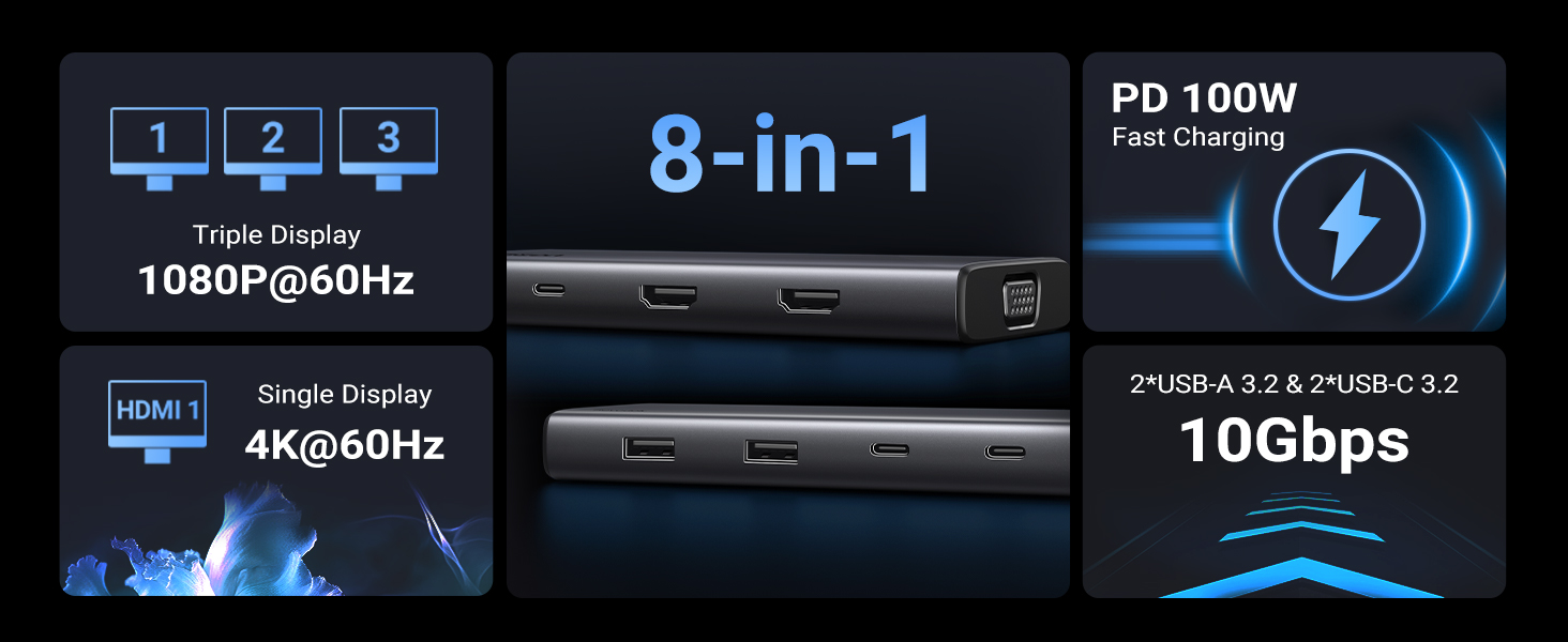 - 8 in 1 USB C Laptop Docking Station: Ugreen triple docking station equips with two 4K HDMI ports, a 1080p VGA port, two 10 Gbps USB-C 3.2 Gen 2 ports, two 10 Gbps USB-A 3.2 Gen 2 ports, 100W Power Delivery
