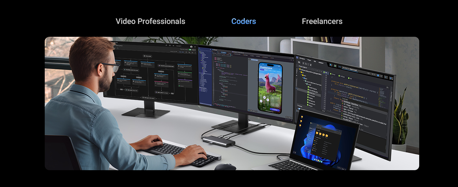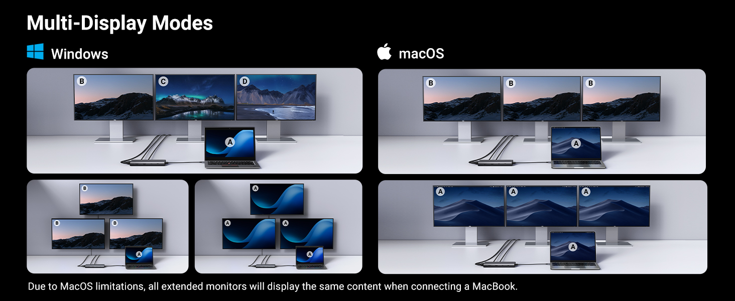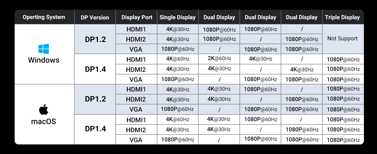 - 1080P@60HZ Triple and Dual docking station: This USB C adapter laptop docking station enables dual or triple display setups, delivering stunning 1080P resolution for both configurations. Please note that only Windows systems support MST-Multi Stream Transport for triple display, while Mac systems are limited to SST-Single Stream Transport