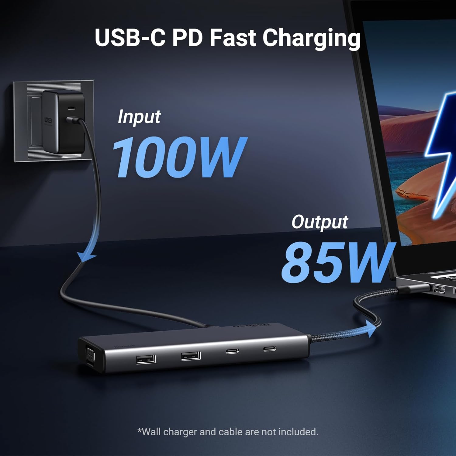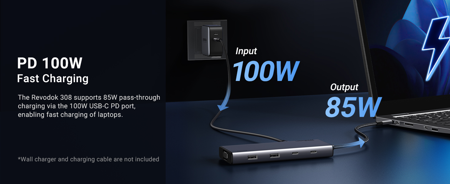 - Robust 100W Power Delivery: Our type c hub docking station offers up to 85W of USB-C pass-through charging via the PD port, ensuring your laptop stays fully charged while reserving 15W for seamless operation of other ports. Enjoy the convenience of high-power charging designed . Please note that the Type-C PD charging port is compatible only with PD-equipped devices