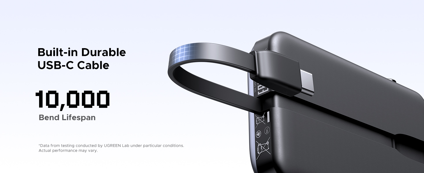 Say goodbye to cable clutter and the panic of forgetting your cords. The ingeniously integrated USB-C cable is always with you, tucking neatly into the body. This feature makes the UGREEN Uno incredibly convenient for travel, work, or study. Simply unfold the cable and connect to your device for instant power. Furthermore, it includes both USB-A and USB-C output ports to charge additional devices.