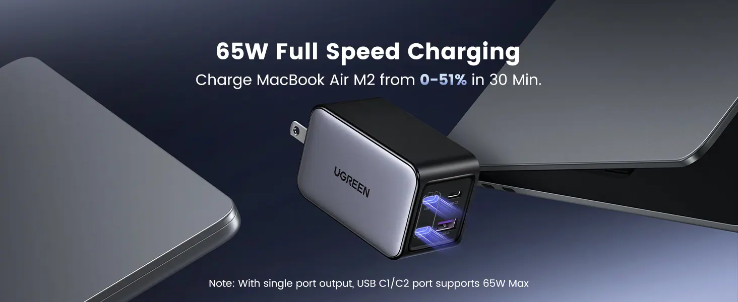 - MacBook Air M2: 0-51% in 30 mins (vs. 35% with standard 30W charger)