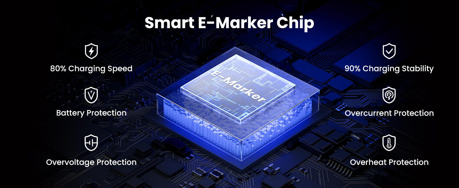 - BUILT-IN INTELLIGENT E-MARKER CHIP: The chip is equipped with over-current, over-heating and over-voltage protection, which ensures that the USB C to USB C cable can stably output 100W high-speed charging, which is both fast and safe