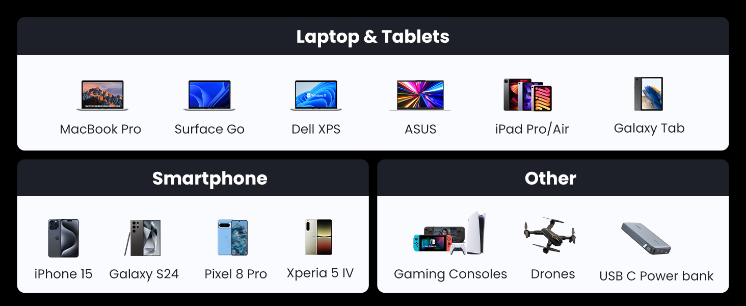 - UNIVERSAL CHARGING SOLUTION: Paired with 20W/30W/45W/60W/65W/87W USB-C charger, this 100W USB C to USB C cable is designed to charge USB-C devices such as mobile phones (iPhone 15/15 Pro/15 Pro Max, Galaxy S24/S23/z fold 5/A35, Pixel 8/7, Moto G Play), tablets (iPad Air/Pro, Galaxy Tab S9, Surface Pro 9), laptops (MacBook Pro/Air, Dell XPS, ) and other USB-C devices (Steam Deck, AirPods Pro 2)