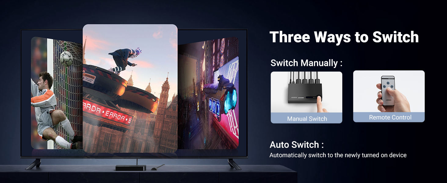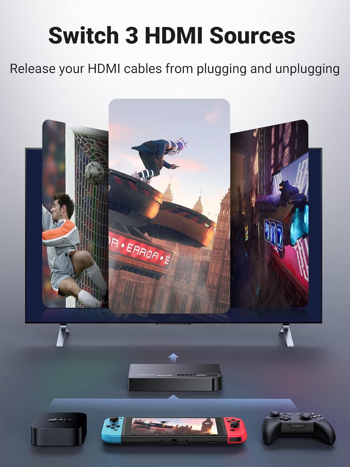 Introducing the UGREEN 4K HDMI switch box, your ultimate solution for seamlessly streaming video and audio from 3 HDMI devices to a single HDMI display. Say goodbye to the hassle of constantly plugging and unplugging HDMI cables, allowing you to effortlessly switch between work and gaming across three different devices.