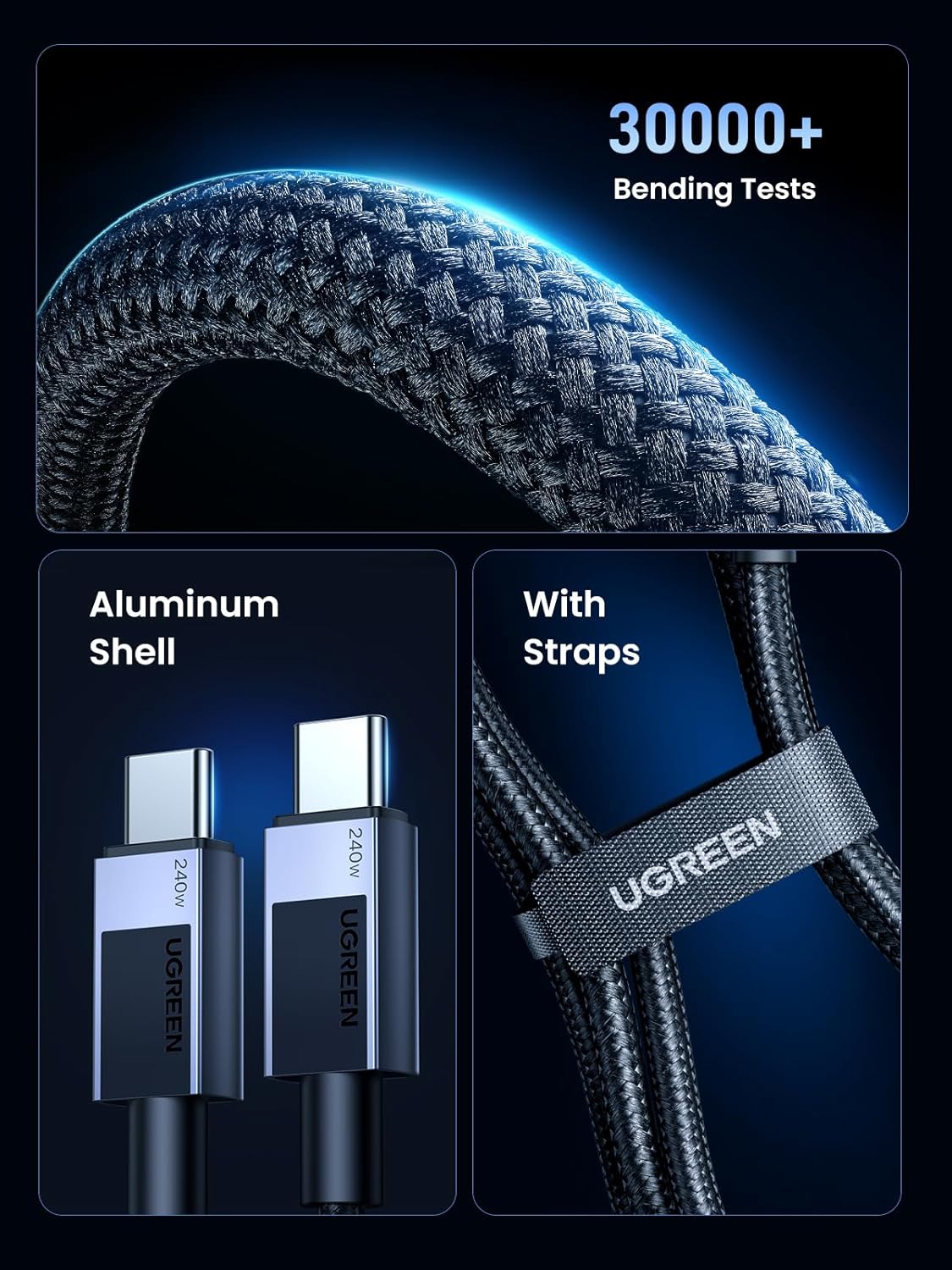 - What you get: 1x UGREEN 240W USB C to C Cable with Strap.