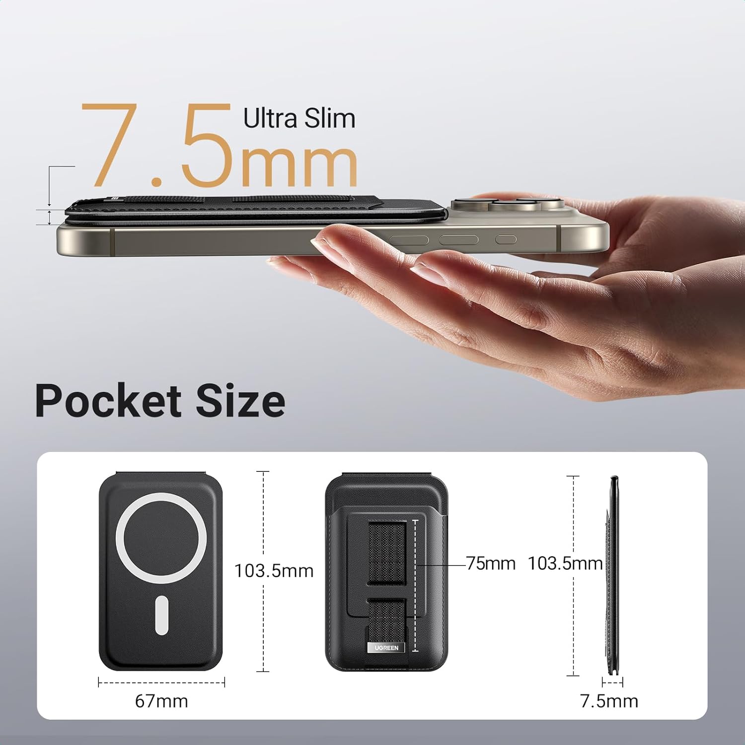 Upgrade your iPhone experience with the all-in-one UGREEN 45166 MagSafe Wallet. This innovative accessory combines a secure card holder, a versatile phone stand, and a safety grip into one sleek, ultra-thin design, freeing you from the need to carry a separate wallet.