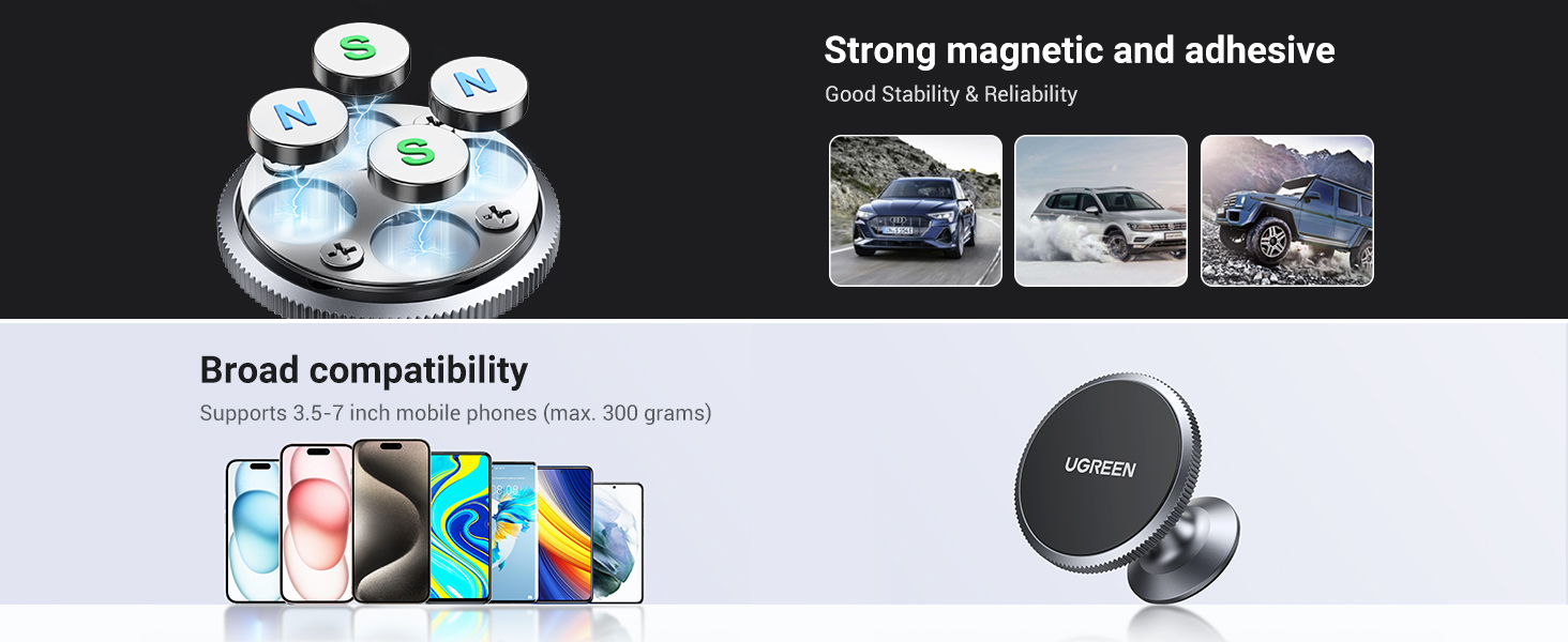 The Car Dashboard Magnetic Sticky Phone Mount adopts aluminum alloy as the base that is solid enough to support your phone’s weight firmly. The silicone pad protects the phone from slipping and scratching. The 4 neodymium magnets are arranged so scientifically that the magnetic holder won’t cause interference with your phone’s navigation signal, communication signal, etc., keeping you online all the time. The mount is phone case friendly – no need to remove your protective case. For a complete car setup, check out our UGREEN Car Chargers or Vention Mobile & Laptop Stand. Shop quality accessories
