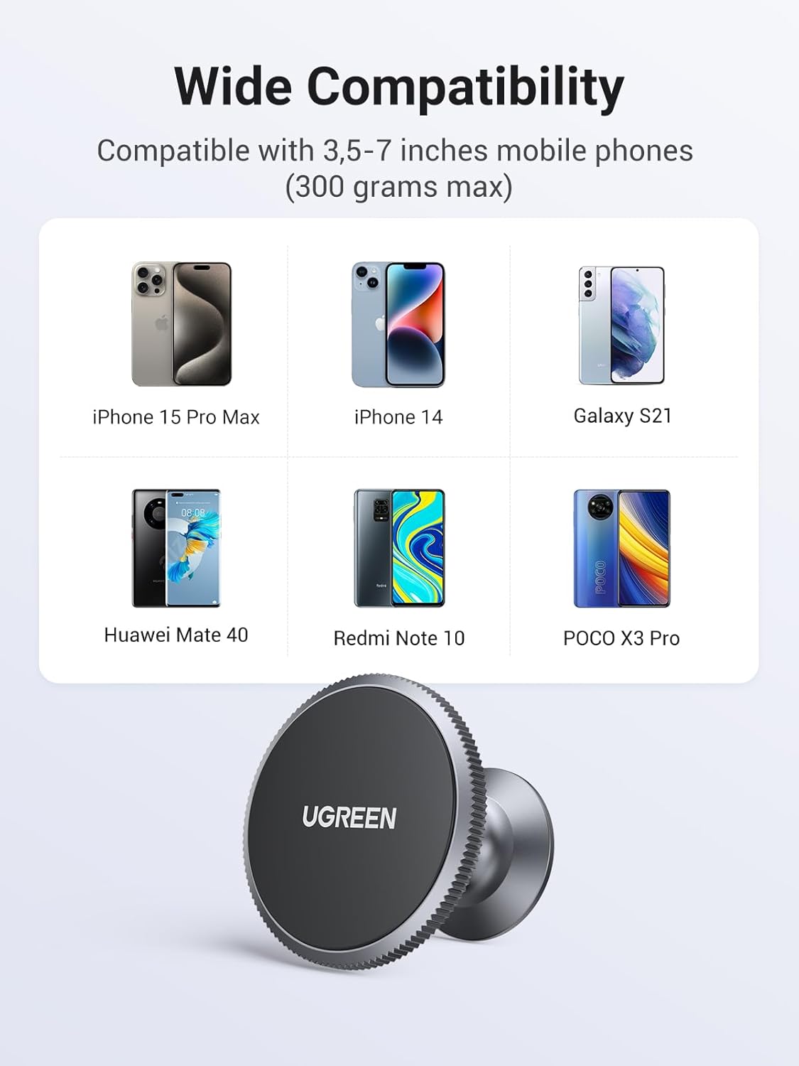 - This magnetic car phone holder is compatible with smartphones smaller than 7 inches. It works with Apple iPhone 16 Pro Max, 16 Pro, 16 Plus, 16; iPhone 15 Pro Max, 15 Pro, 15 Plus, 15; iPhone 14 Pro Max, 14 Pro, 14 Plus, 14; iPhone 13 series, iPhone 12 series, iPhone 11 series, iPhone XS Max, XR, X, iPhone SE, iPhone 8, 7, 6 series. For Samsung, it works with Galaxy S24 Ultra, S24+, S24; Galaxy S23 Ultra, S23+, S23; Galaxy S22 Ultra, S22+, S22; Galaxy S21 Ultra, S21+, S21; Galaxy S20 series, Galaxy Note 20, Note 10, Note 9, Note 8, Galaxy A series. For Google, it works with Pixel 9 Pro, Pixel 9, Pixel 8 Pro, Pixel 8, Pixel 7 Pro, Pixel 7, Pixel 6 Pro, Pixel 6, Pixel 5, Pixel 4a, Pixel 4 XL. For Huawei, it works with P40 Pro, P40, P30 Pro, P30 Lite, P30, P20, P10, P9, P8, Mate series. Also compatible with Xiaomi, OnePlus, Oppo, Vivo, Motorola, Nokia, and all other smartphones between 3.5″ and 7″.