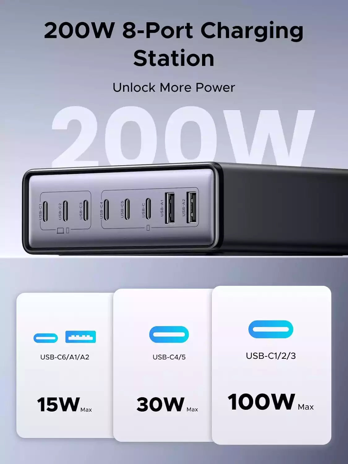 Powered by advanced GaN (Gallium Nitride) semiconductors, this charger is significantly more efficient, compact, and cooler-running than traditional silicon-based chargers. It intelligently distributes up to 200W of total power, with a dedicated 100W USB-C port capable of fast-charging a 16-inch MacBook Pro. Whether you’re a professional, gamer, or a family with numerous gadgets, this station delivers robust, reliable power without overheating.