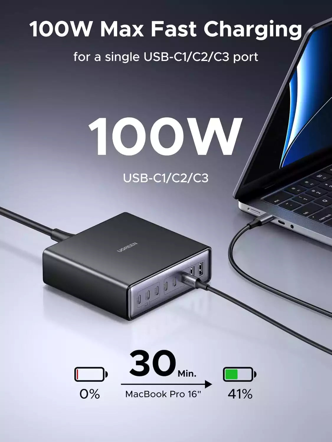 The thoughtful desktop design transforms your charging experience. The included long 2-meter power cord provides placement flexibility, allowing you to create a dedicated charging station on your desk, console table, or bedside. By centralizing all cables into one hub, you eliminate clutter, reduce stress, and ensure every device is ready to go when you are. For the fastest charging, use certified UGREEN USB-C cables.