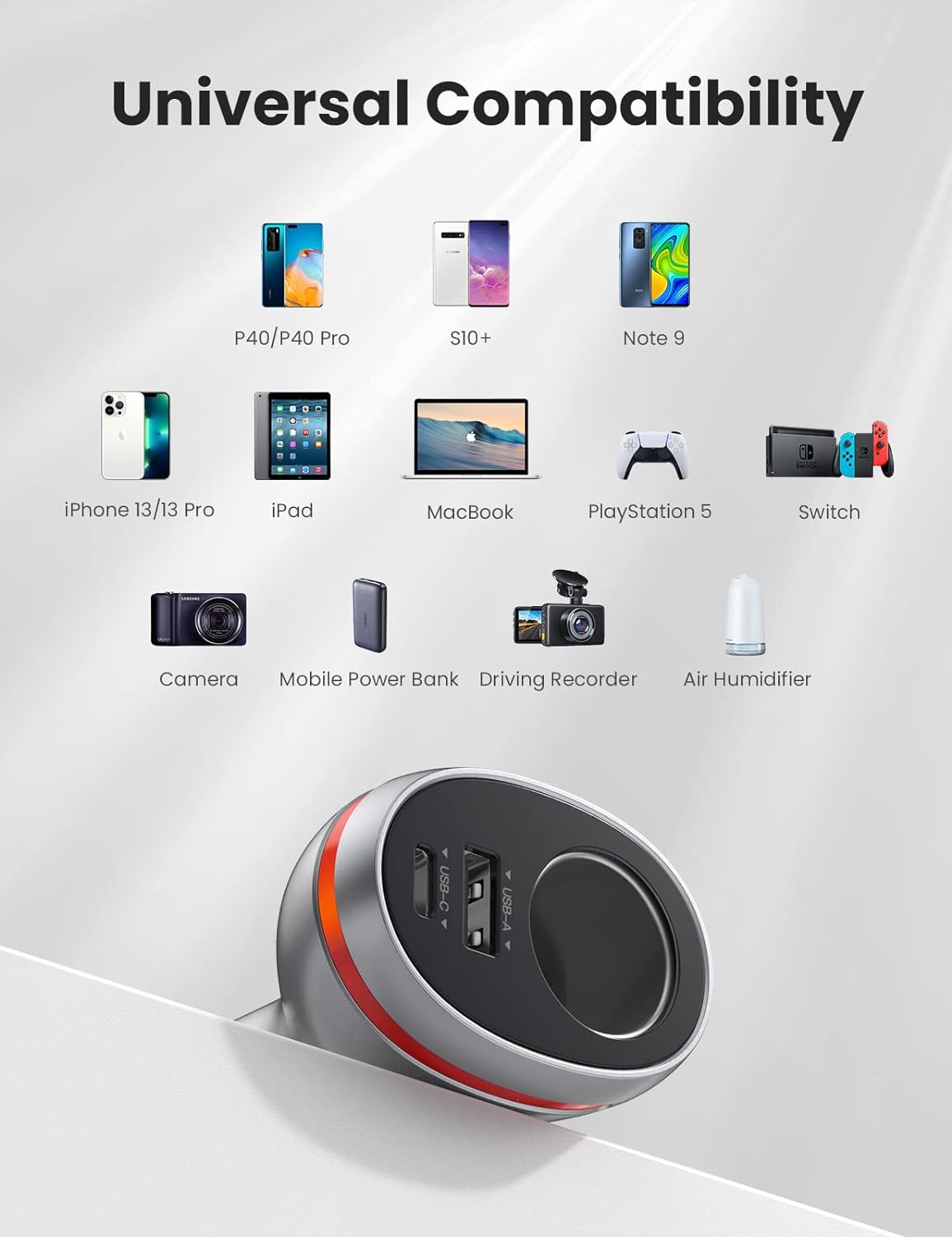- Type: 3-Port USB-C & USB-A Car Charger with Cigarette Lighter Socket