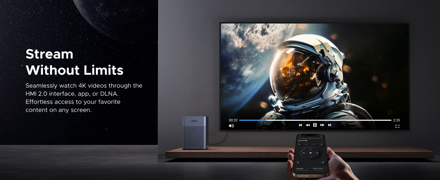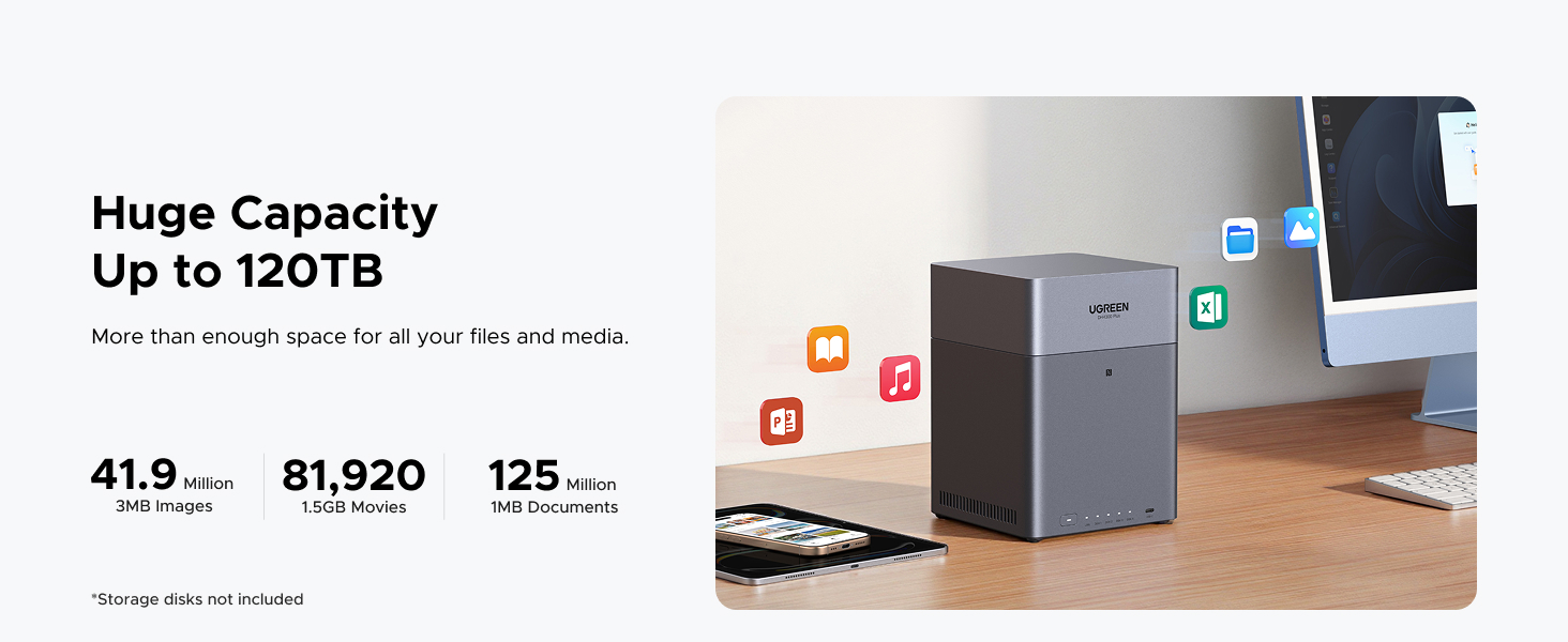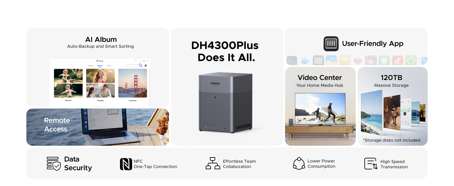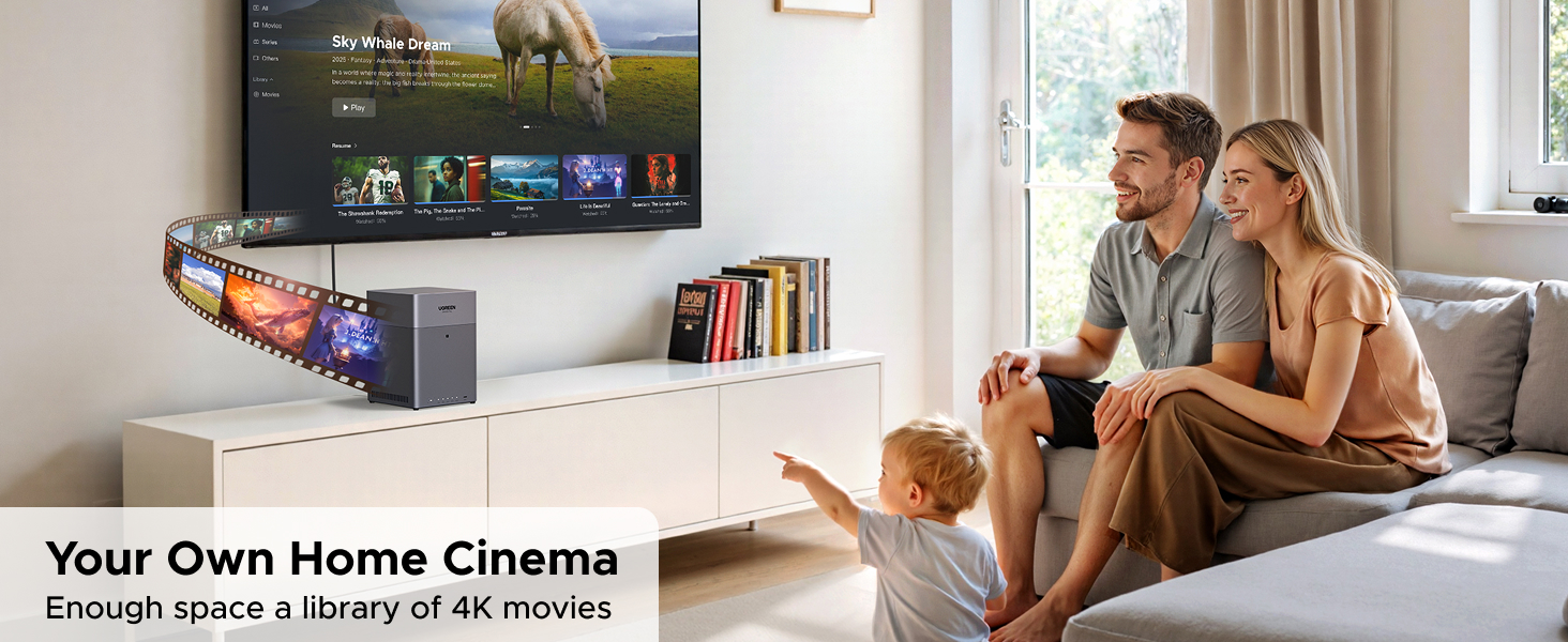 With support for up to 120TB of raw storage across four drive bays, you have ample space to consolidate all your family photos, 4K movies, work documents, and system backups in one centralized location. Powered by an 8-core Rockchip ARM processor and 8GB of LPDDR4X RAM, it efficiently handles file sharing, media transcoding via the 4K HDMI output, and runs a wide array of apps from the UGREEN App Store.