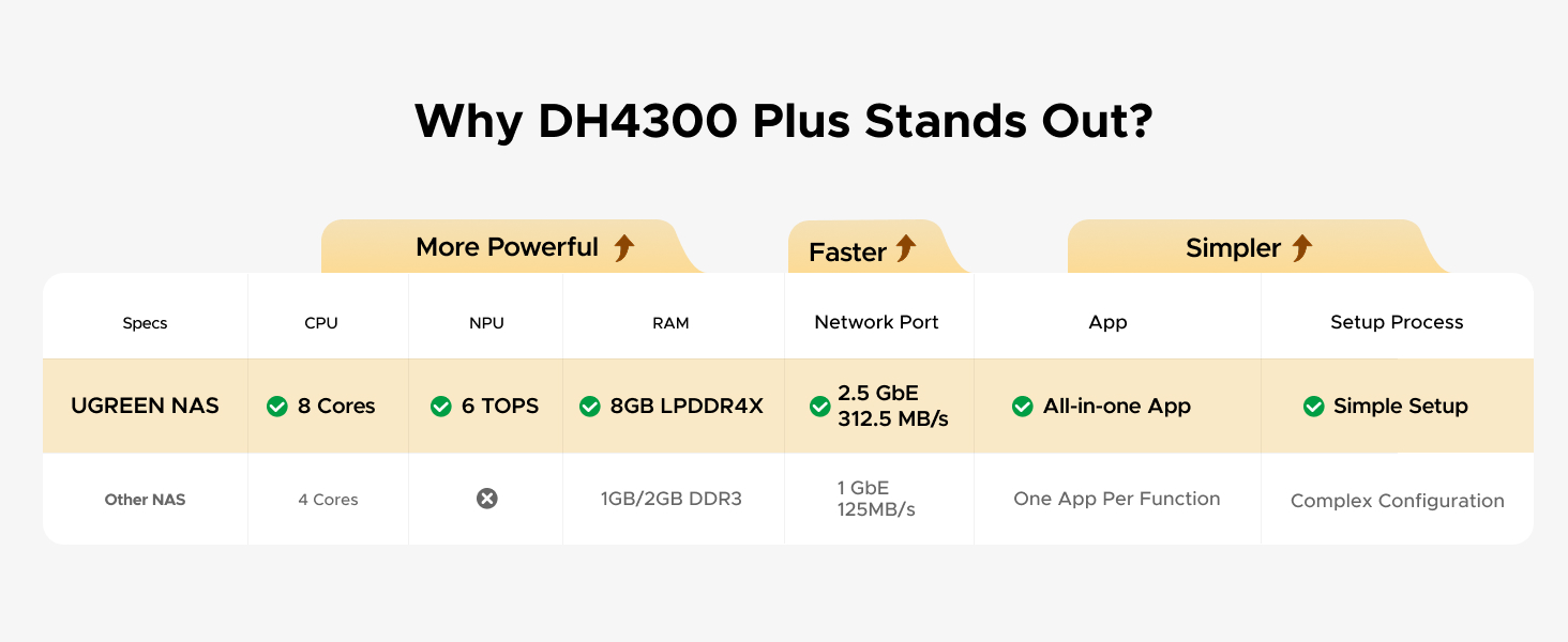 Thanks to its energy-efficient ARM architecture, the DH4300 Plus consumes significantly less power than NAS devices with x86 CPUs, making it cheaper to run 24/7.