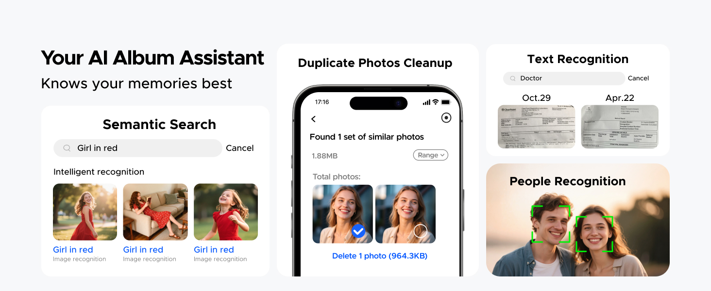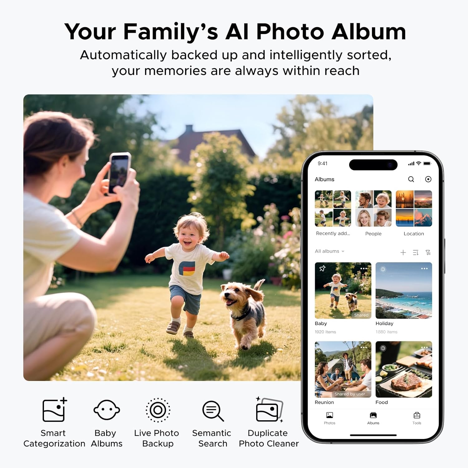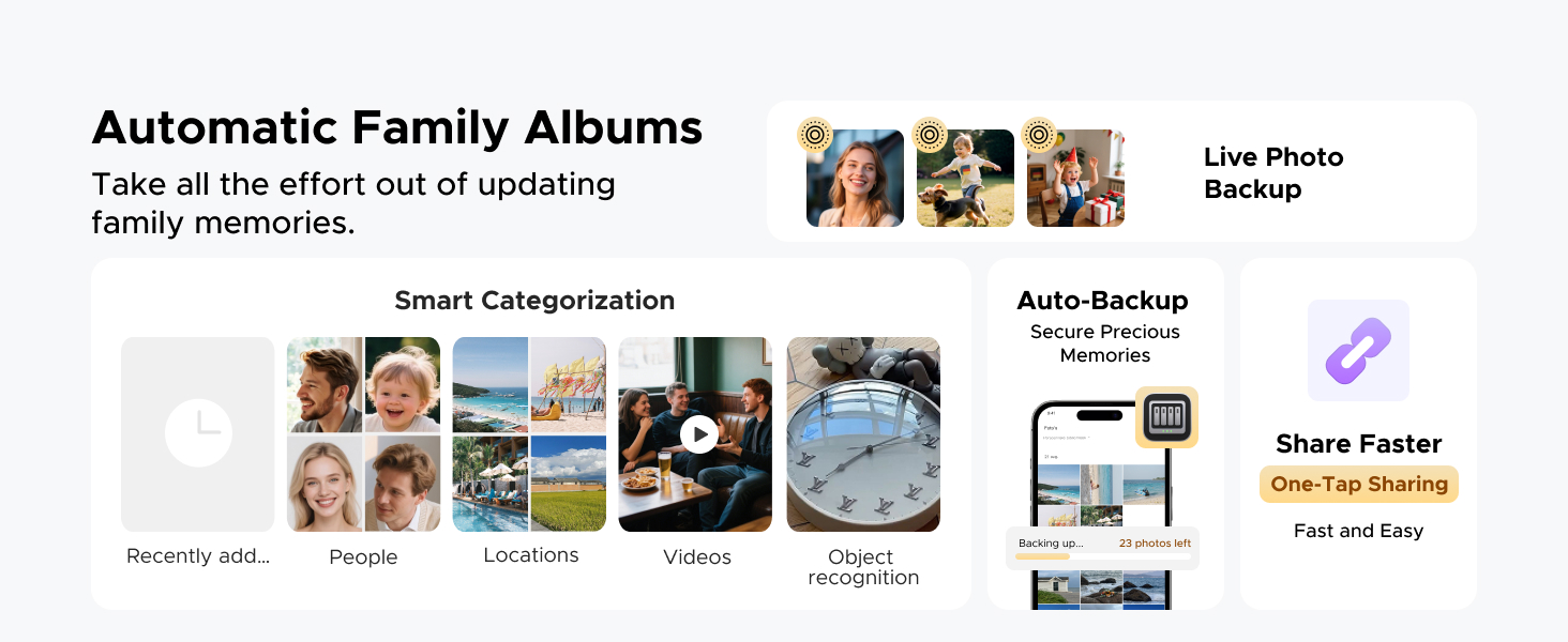 The AI engine automatically scans your photos and identifies faces, objects, and locations. It then creates searchable albums, so you can instantly find all photos of a specific person or from a certain vacation.