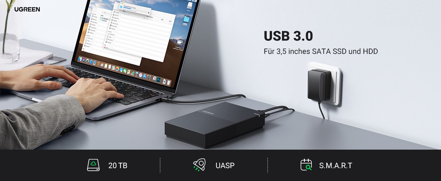 UGREEN 70337 Hard Drive Enclosure 3.5 Inch USB 3.0 SATA Hard Drive Enclosure for 3.5/2.5 SSD and HDD Enclosure Supports UASP and Maximum 20TB Drives with Power Supply