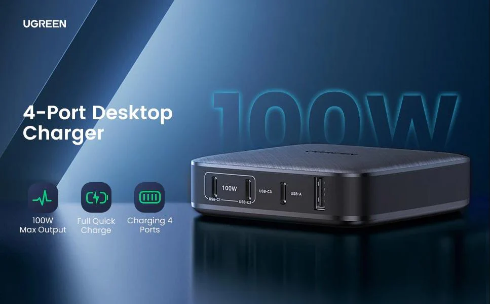 The UGREEN 70870 USB C 100W 4-Port Desktop PD Charger is a high-performance charging station designed to quickly power multiple devices simultaneously. Whether you’re at home, at the office, or traveling, this compact charger provides reliable and efficient charging for up to four devices, including laptops, smartphones, and tablets.