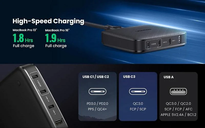 - The UGREEN 70870 offers a total power output of 100W, which is perfect for charging high-power devices like laptops and tablets.