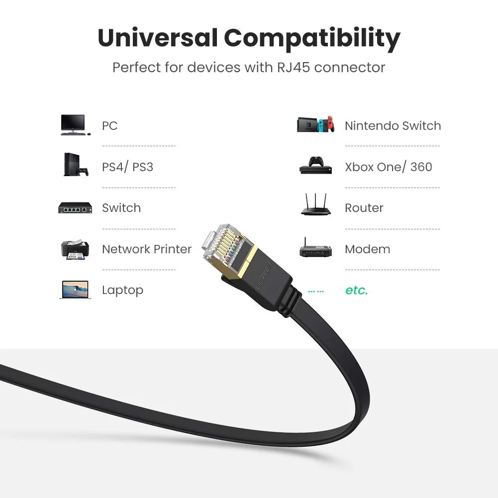 The UGREEN 80425 CAT7 ethernet cord is compatible with a wide range of devices, including iMac Pro, PS3, PS4, PS4 Pro, Xbox, Xbox One, Smart TV, Sky Q box, WiFi extender, Switch, TP-Link router, game consoles, Raspberry Pi 4, PC, printer networks, TV boxes, modems, patch panels, and Blu-ray players. It’s also backward compatible with Cat6, Cat5, and Cat5e RJ45 connector devices.