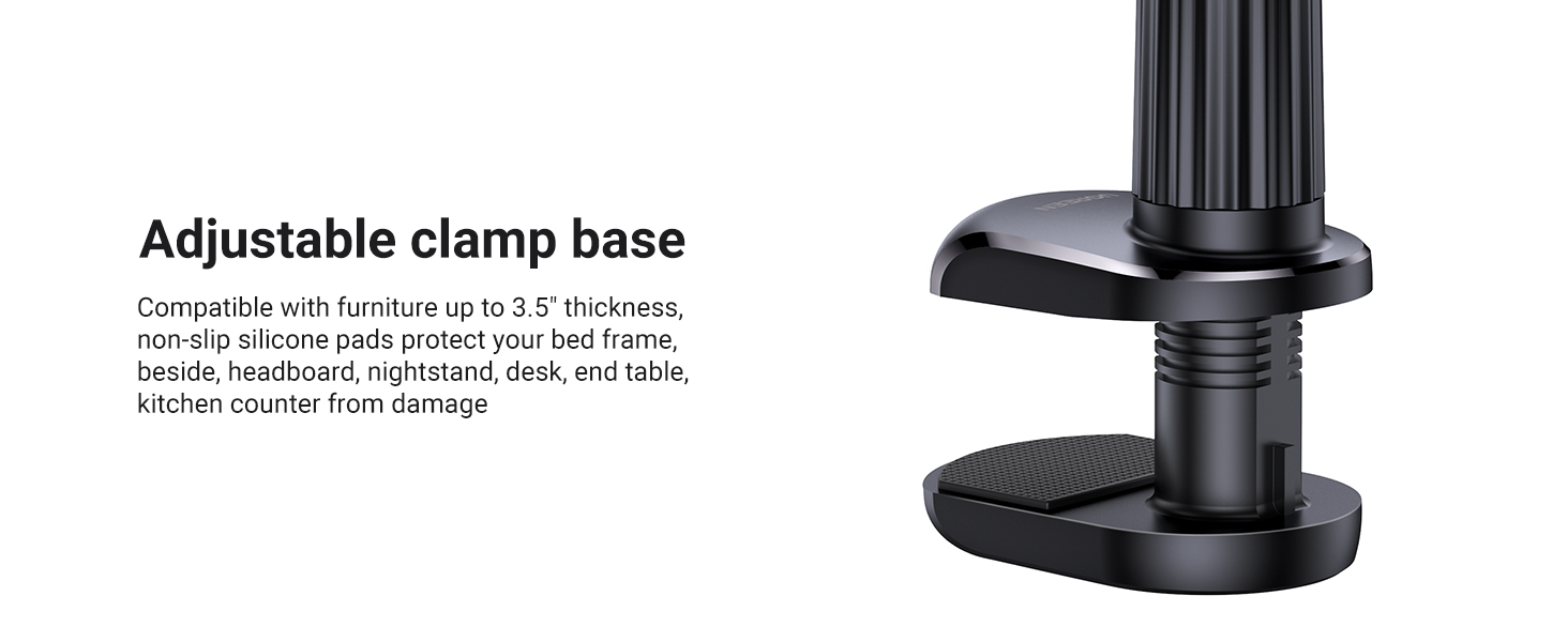 The clamp is versatile and can be securely attached to desks, tables, bed headboards, kitchen counters, or any surface up to 8cm thick.