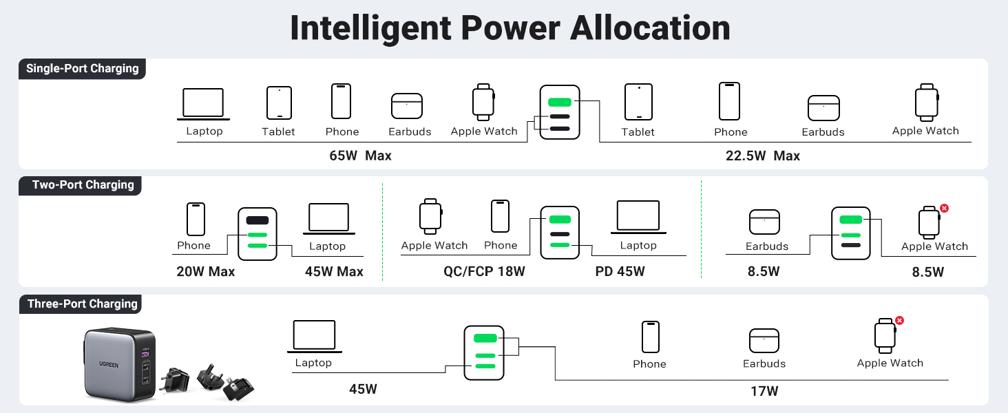 UGREEN 90409 65W USB C Charger, Nexode 3 Port Travel Charger GaN Fast International Charger with US UK EU Plug, USB C Power Adapter for MacBook Pro/Air, Dell XPS, iPhone 15/14, iPad, Galaxy S23, Steam Deck