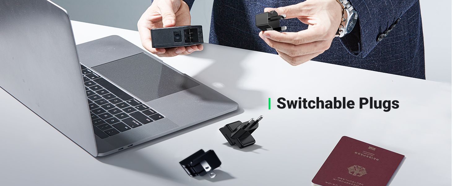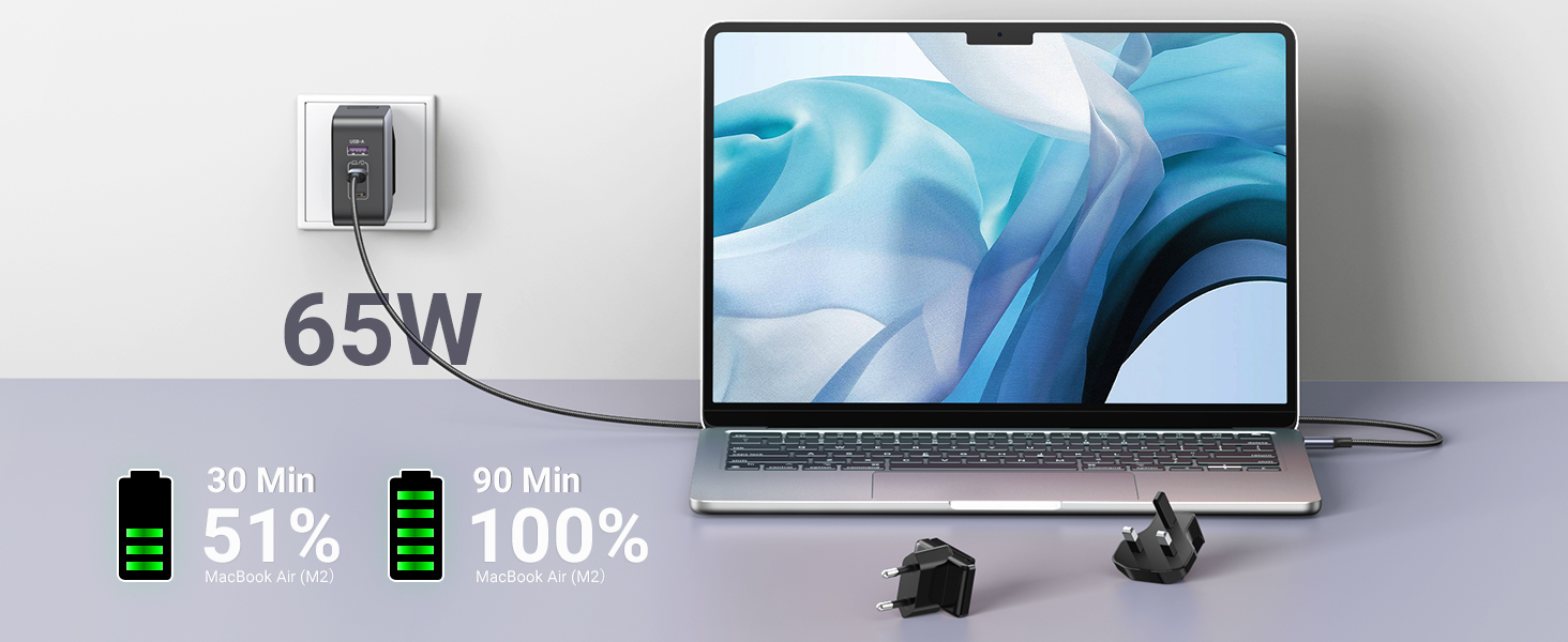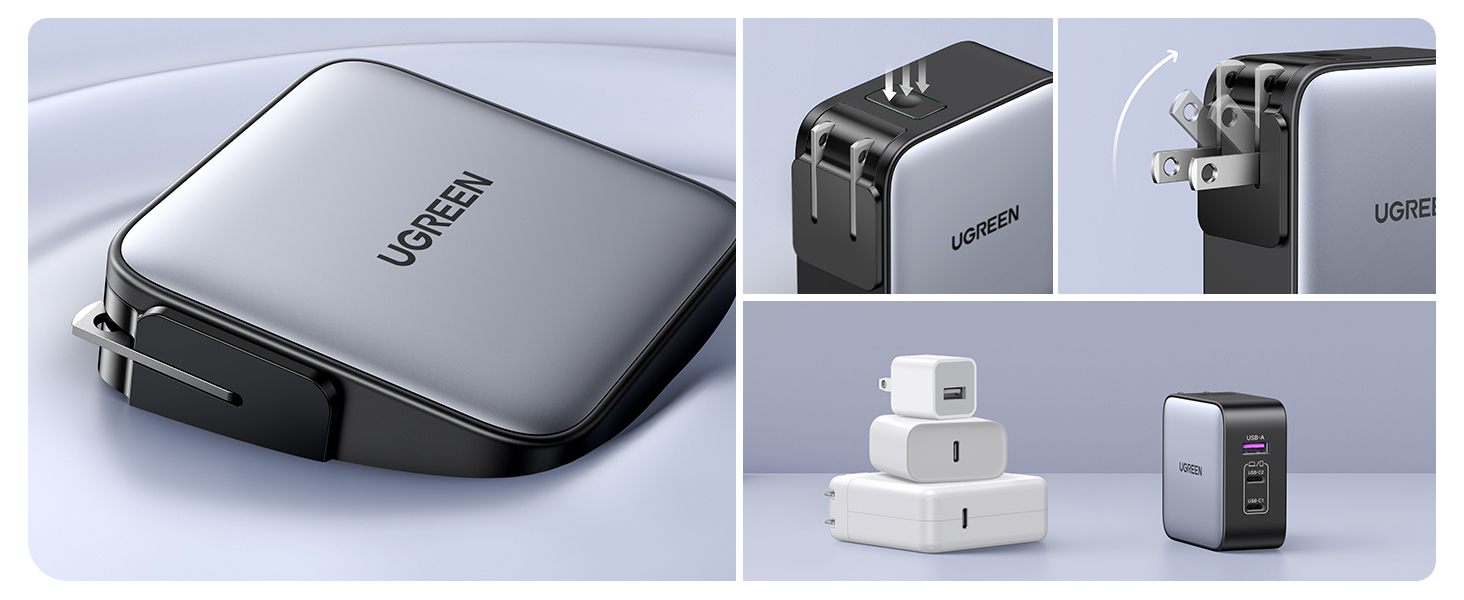 UGREEN 90409 65W USB C Charger, Nexode 3 Port Travel Charger GaN Fast International Charger with US UK EU Plug, USB C Power Adapter for MacBook Pro/Air, Dell XPS, iPhone 15/14, iPad, Galaxy S23, Steam Deck