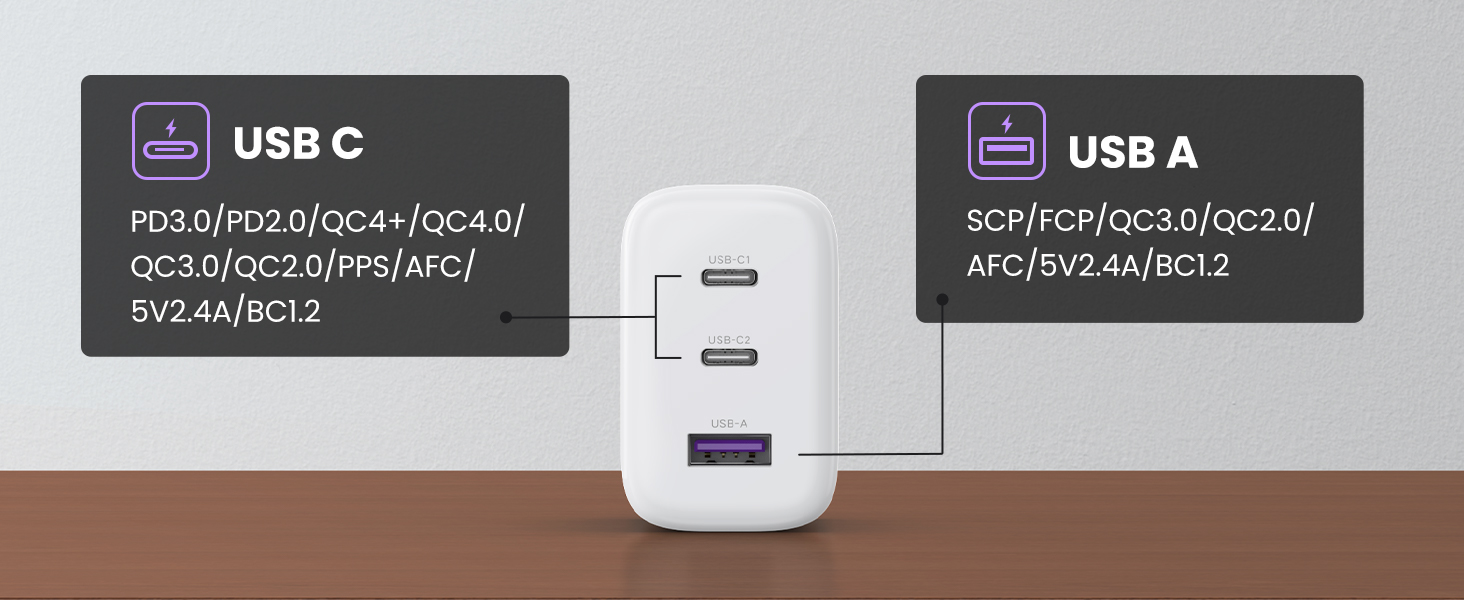 - Power up 3 devices at once: the USB C charger block with 2 USB C ports and 1 USB A port, therefore it supports to power 3 devices at once, and you can charge your laptop, tablet and watch simultaneously