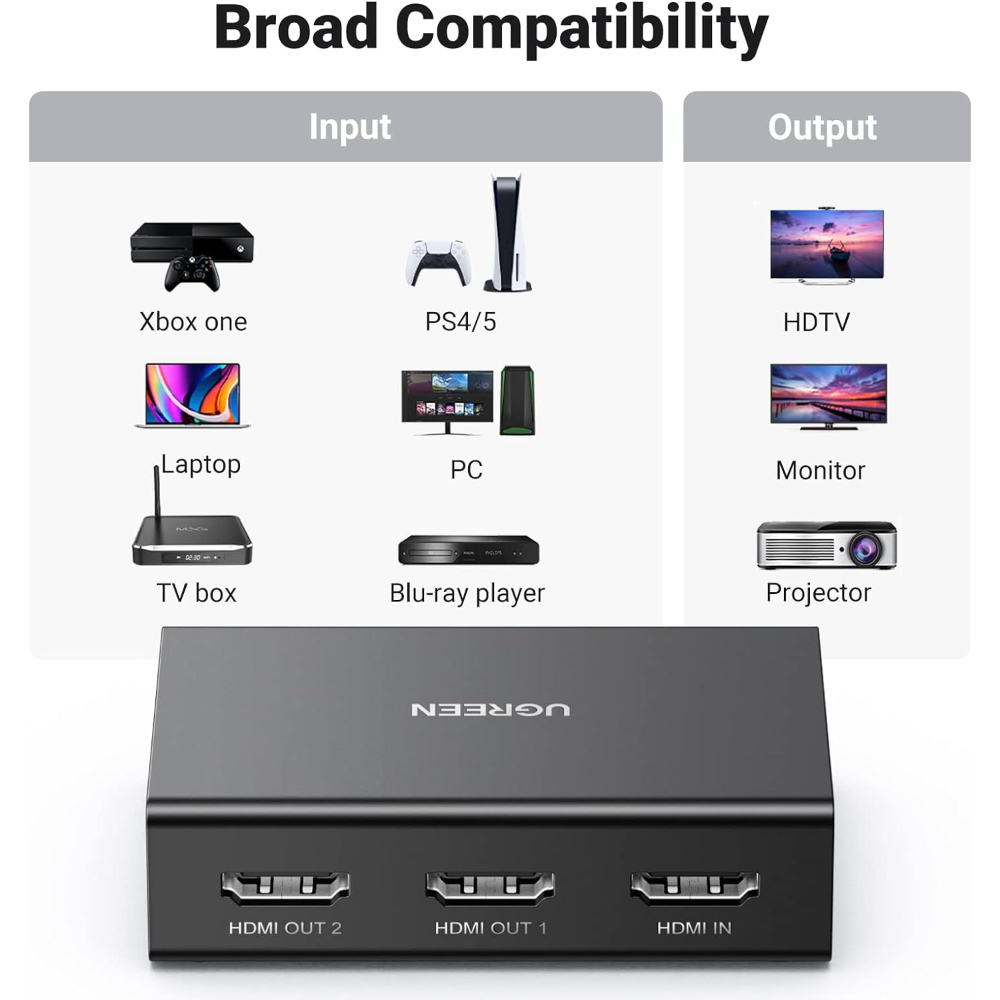Upgrade your entertainment or workspace with the UGREEN 90513 HDMI Splitter, designed to duplicate 4K HDR content across two displays without quality loss. Whether you’re a gamer, streamer, or home theater enthusiast, this splitter delivers crystal-clear 4K@60Hz with HDR and zero latency—ideal for: