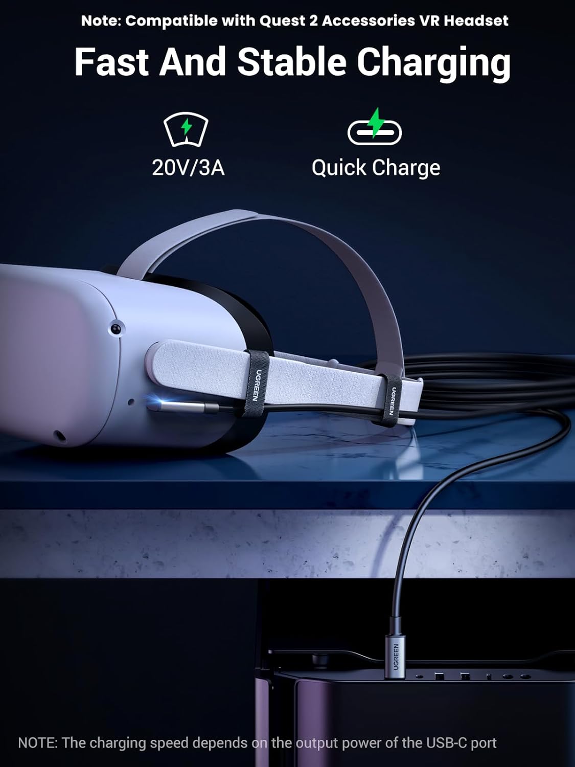 The key advantage is its 60W Power Delivery fast charging capability. Output power up to 20V/3A supports fast charging for laptops, phones, and tablets while simultaneously syncing data. The cable supports USB 3.0 with 5Gbps transfer speed , making data transfer between PCs smooth and enabling transfer of large volumes of video and game files. (Please note: when used as a VR Link cable, the maximum speed measured for your VR headset is 2.7Gbps). For more high-speed cables, consider the UGREEN 240W USB C Cable and the UGREEN USB C 3.1 Gen 2 Cable.