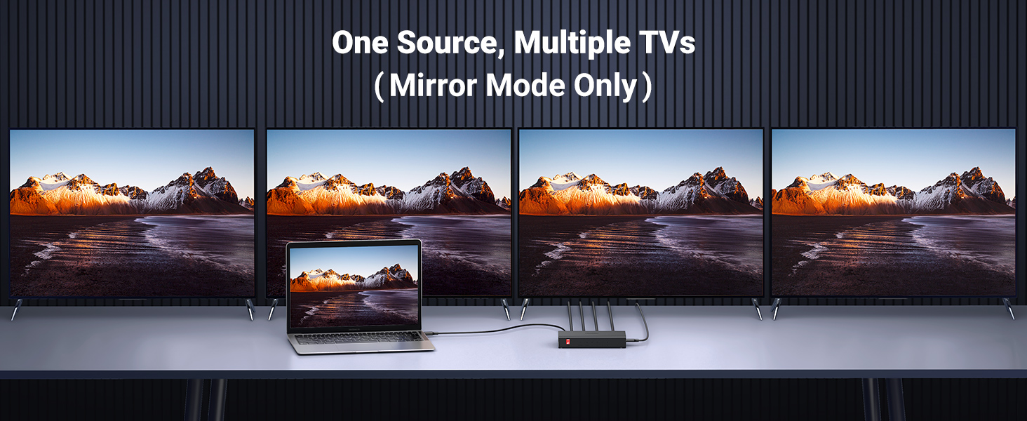 A: No, this is a mirroring splitter, meaning it duplicates the same signal from one source to all four displays. All screens will show identical content simultaneously. If you need different content on each screen, you would require a matrix switcher. UGREEN offers a variety of solutions for different needs. -