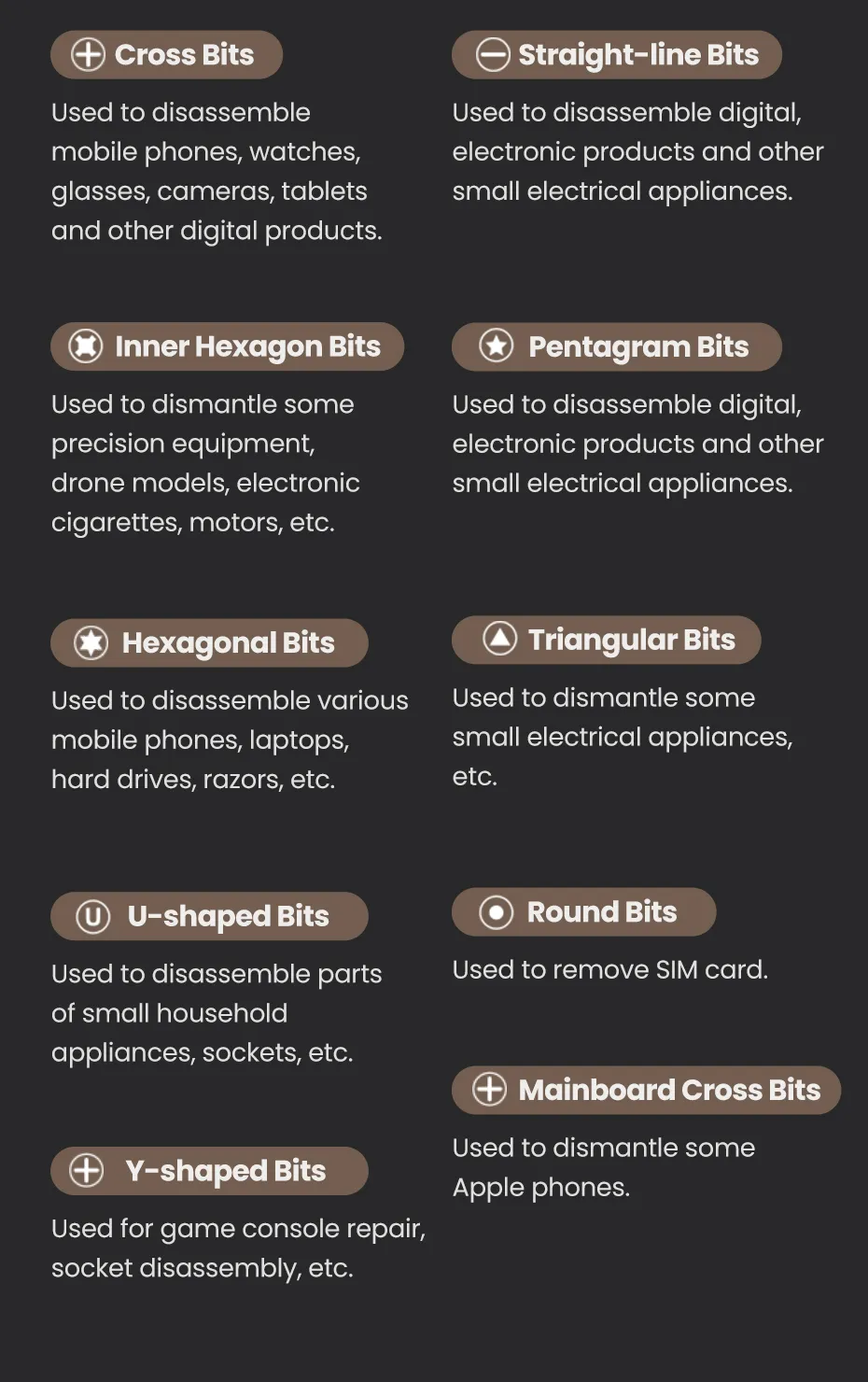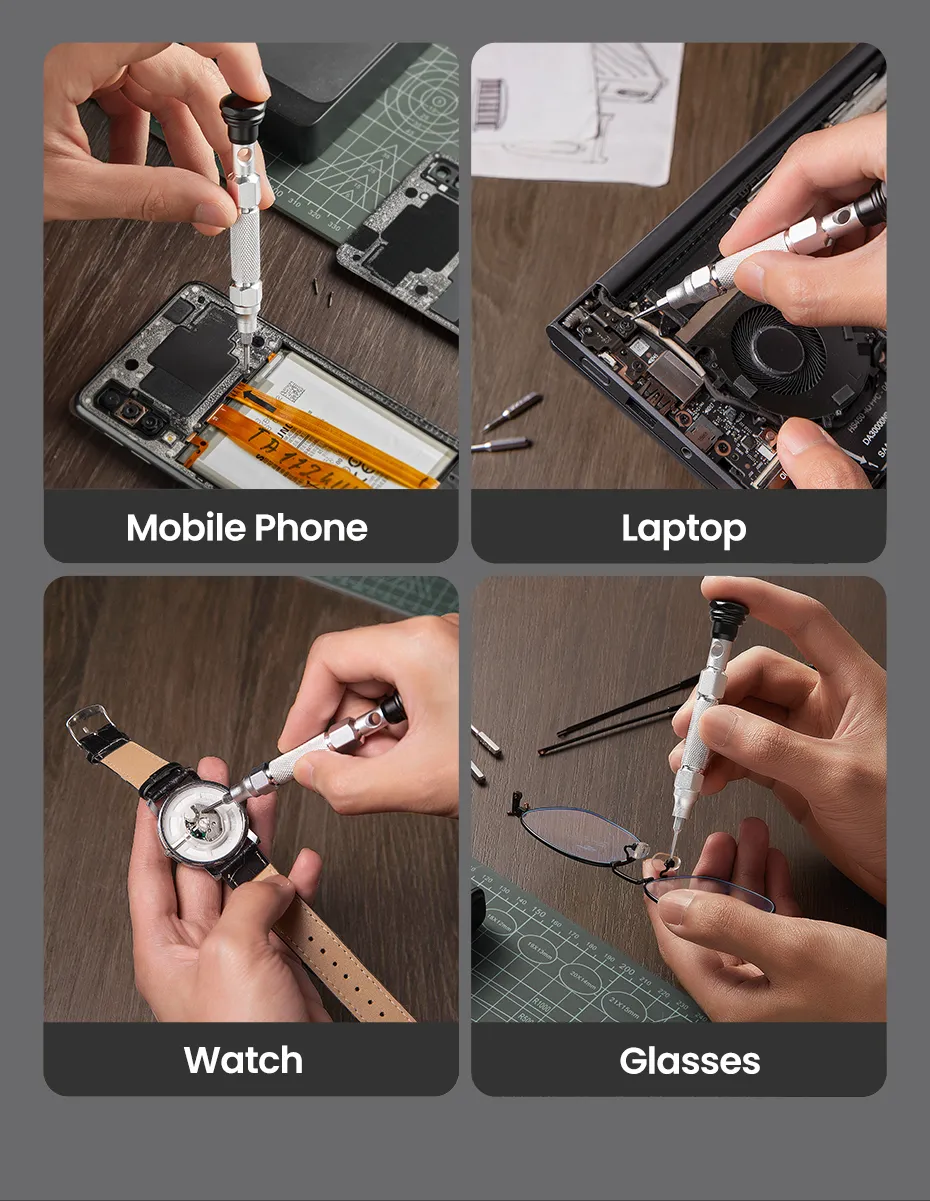 - Precision Bits: Includes a variety of slotted and hex bits for accurate and detailed repairs.