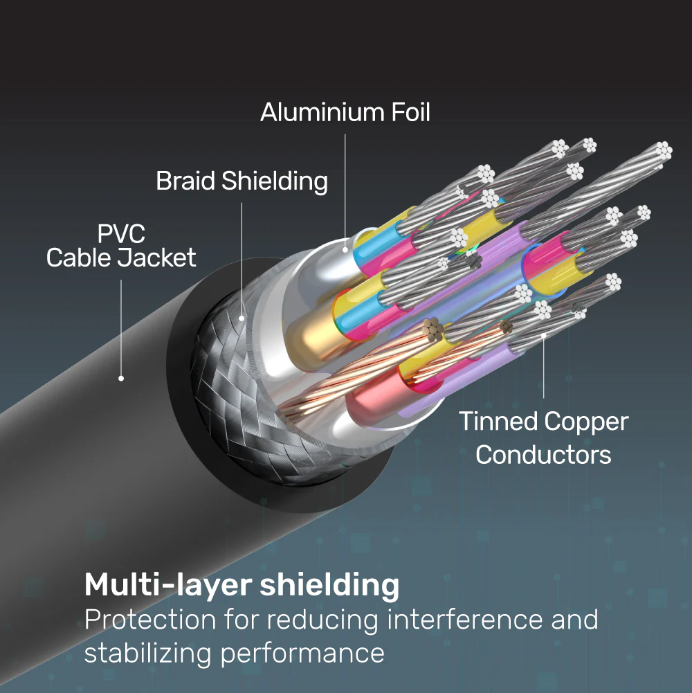 A6: It features corrosion-resistant gold-plated connectors and a 7-layer shielding structure for superior durability and resistance to electromagnetic interference.